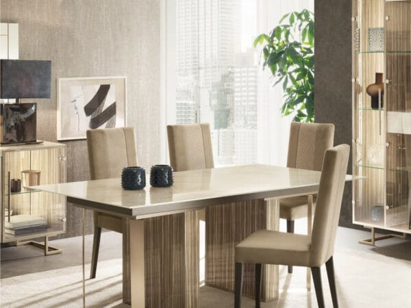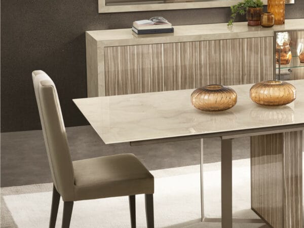 Luce Light ճաշասեղանը շքեղության և ժամանակակից ոճի մարմնացում է: Օնիքսե բաց մարմարե սալիկը և հարթ մակերեսը ճաշասենյակին ճաշասենյակին հաղորդում են լրացուցիչ շքեղություն, նրբագեղություն և հմայք: