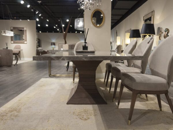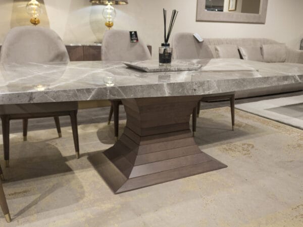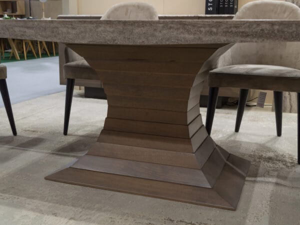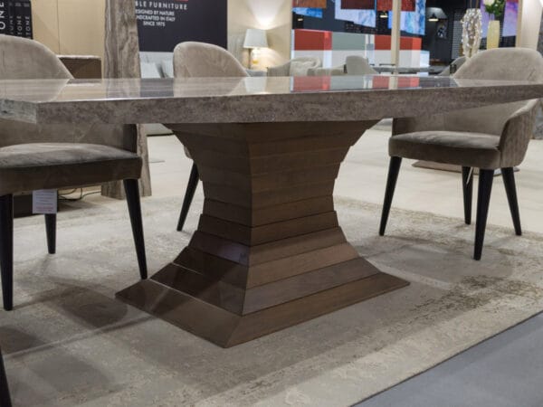 Ցանկացած բնական քարով սեղանի վերնամաս և նավականման հաստ եզրեր։ Ձեռքով պատրաստված հիմք՝ պինդ հաճարենու փայտի շերտերով և այնուհետև լաքապատված մի քանի շերտով ։