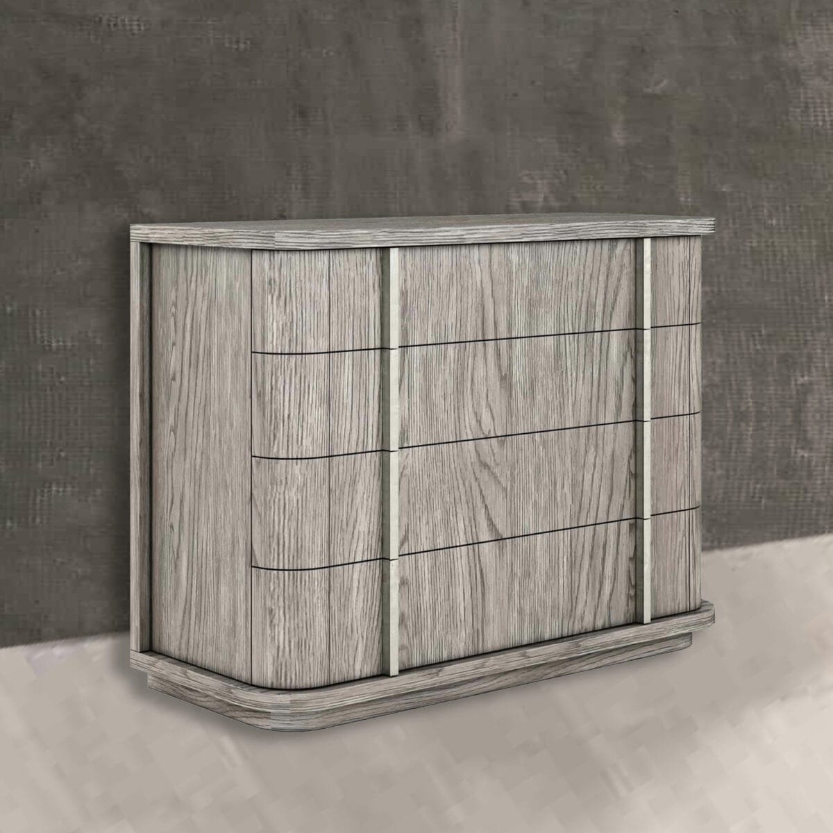 Այս նրբագեղ պարզ իրերի պահոցը ունի պինդ բարդու փայտե շրջանակ՝ երեսպատված կաղնե բաց մոխրագույն ծածկույթով, որը հիշեցնում է ժամանակակից բարձրահարկ շենքի դիզայն: Չորս ընդարձակ գզրոցները ոճային կերպով կպահեն ձեր զգեստապահարանի բոլոր իրերը, իսկ ներքևի գզրոցները պատված են անուշահոտ մայրիով: Առջևի հատվածը լրացվում է մետաղական գույնի գզրոցի մեծ բռնակներով՝ ստեղծելով շարունակական ուղղահայաց տարր՝ հիմքից մինչև վեր: