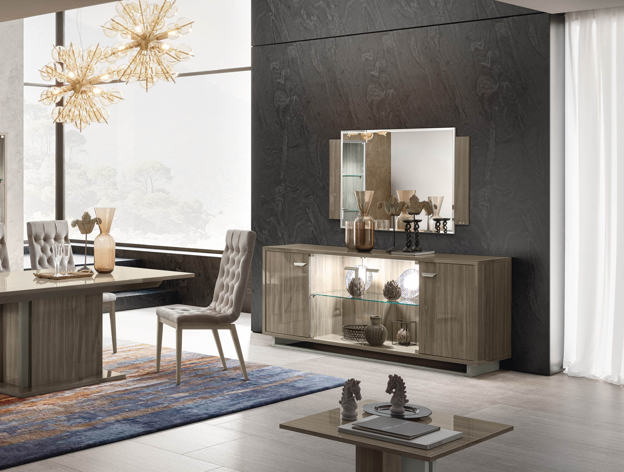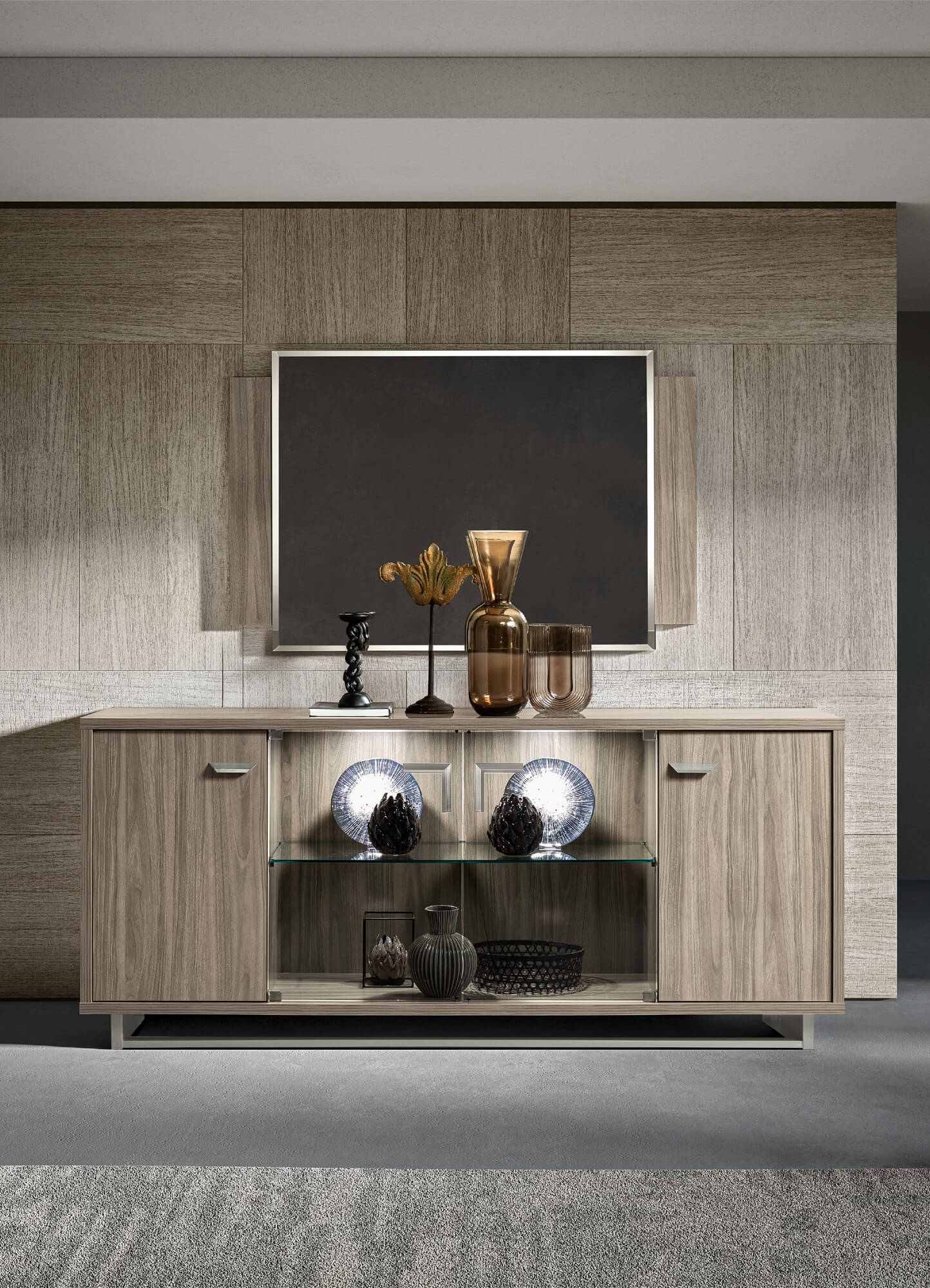 Վերջին թրենդային ծածկույթը՝ քրոմատիկ համակցություններով, որտեղ կնձնի մոխրագույն երանգները աստիճանաբար մթնելով փոփոխվում են քաոսիկ բաց-մուգ երանգների, որոնք հիշեցնում են Վենետիկյան ծովածոցի գեղեցկությունը լուսաբացին: Ֆունկցիոնալ և էսթետիկորեն հաճելի մետաղական բռնակներ: Առկա է նաև երկու կենտրոնական ապակե դռներով, ներքին LED լուսավորությամբ (3000°K) և 8 մմ կենտրոնական ապակե դարակով: