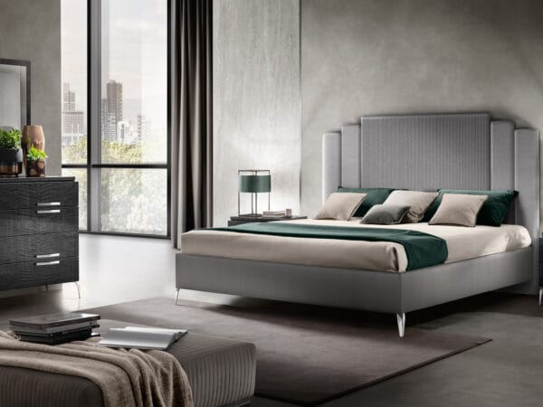 Moderna bed in a smoky grey Sycamore wood finish
