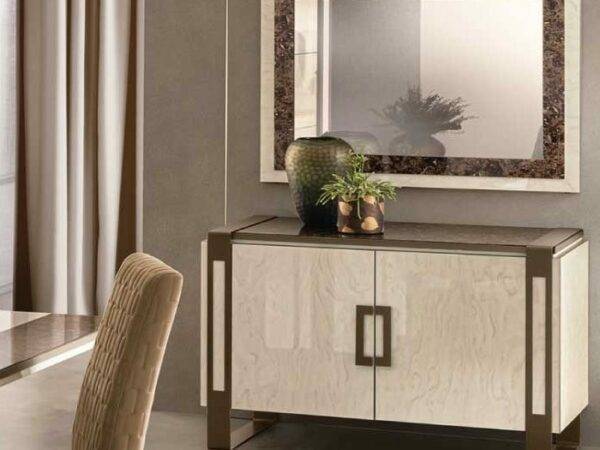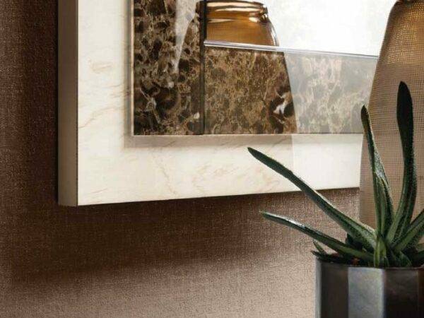 The Poesia mirror is available in two sizes, large and small, and in two versions, with a mirror-effect outer frame and with an ivory marble-effect outer frame. The latter is distinguished by the striking contrast of different yet complementary nuances: the bright nuance of ivory marble discreetly overlaps the dark nuance of the Emperador Dark finish screen-printed glass inner frame, creating a sophisticated and captivating thickness that ends up stealing the show from the mirror.