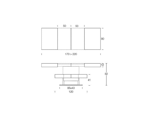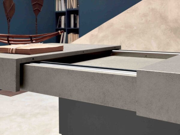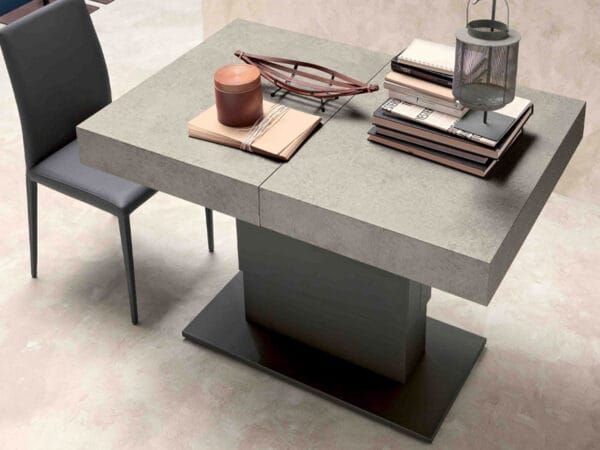 Transforming coffee table which turns into a dining table, steel central column, gas lifting device. Millimetreadjustable height from cm 41 to cm 82, melamine, lacquered, stained wood, mortar-look rectangular top, 2 inside extensions. Hidden under-plate castors. Patented.