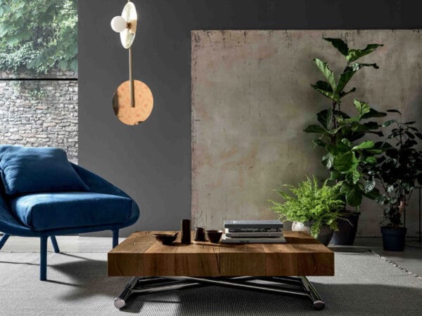 Metal frame transforming coffee table, it turns into a dining table, gas lifting device, millimetre-adjustable height from cm 27 to cm 81, melamine, lacquered, wood or mortar-look rectangular top, 2 inside extensions. Under-base wheels.