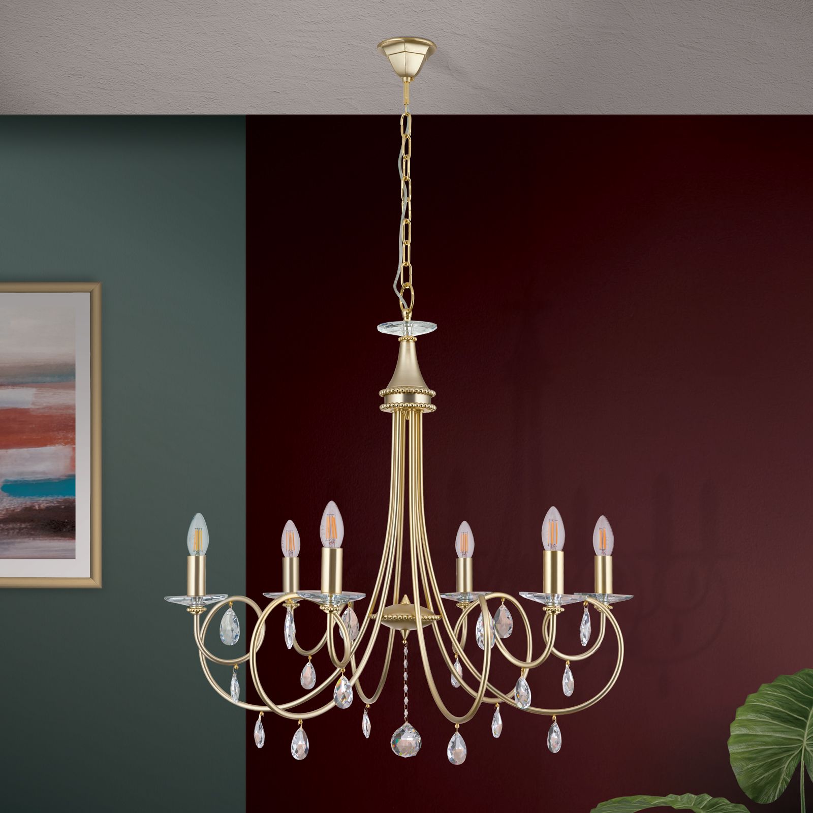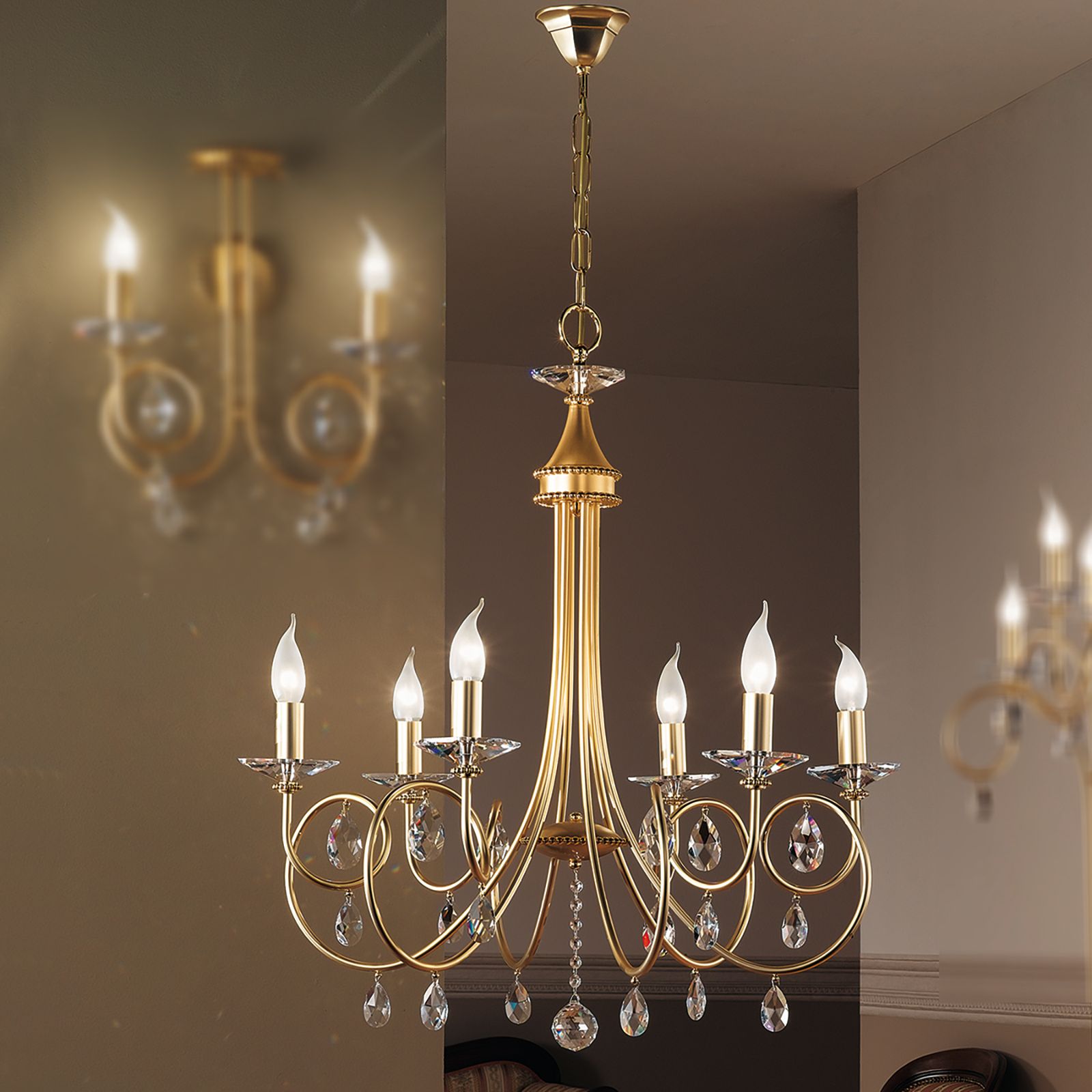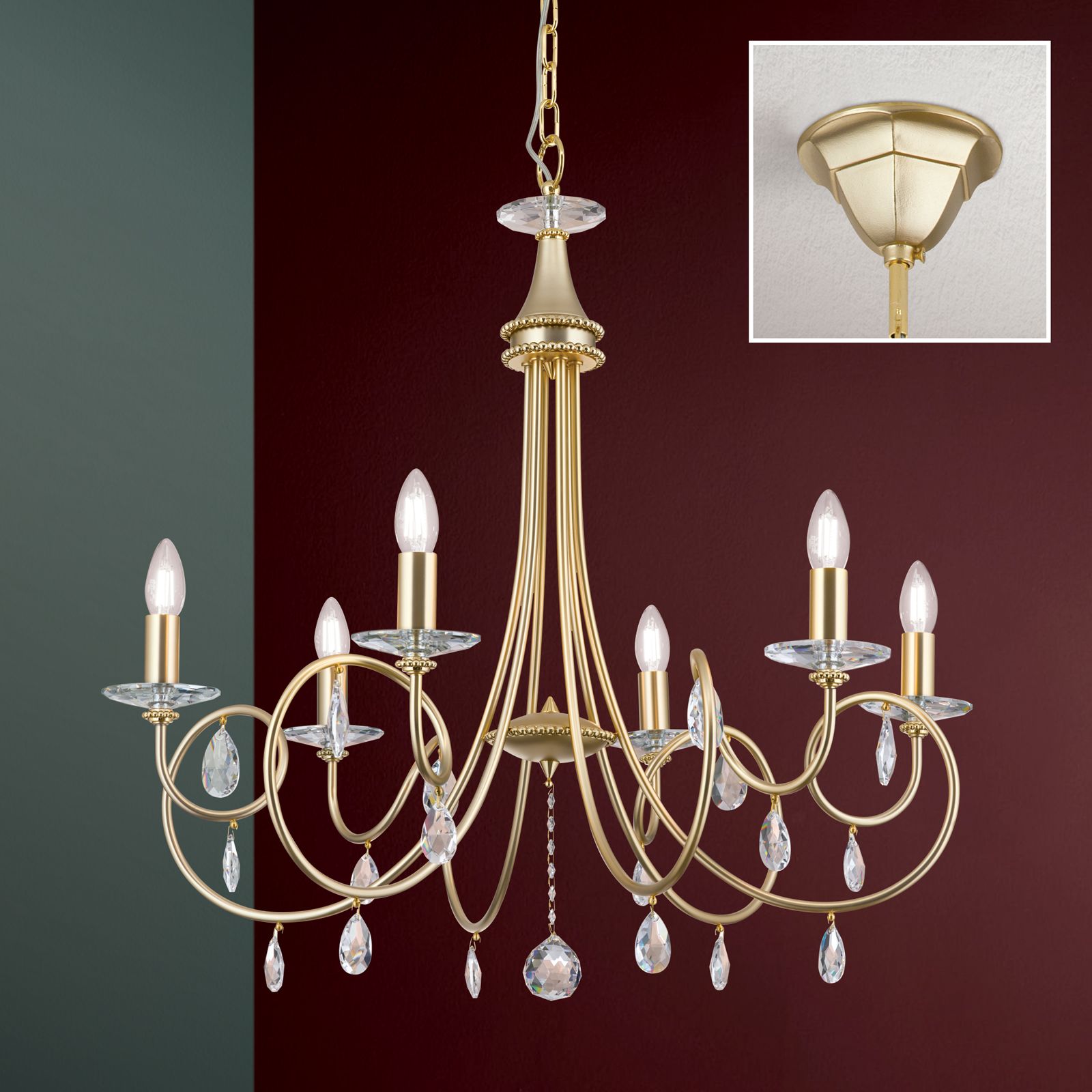 Special six-flame chandelier GIADA gives rooms a festive character. It is fitted with countless 1A full cut crystals tastefully arranged on six curved arms. The bulbs in E14 sockets combined with the chandelier’s crystals create unique lighting effects and an atmospheric ambience in any room. Wing gust candle bulbs are the perfect illuminant choice reminding of candlelight making it look noble and antique despite its modern understatement.