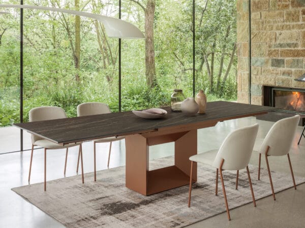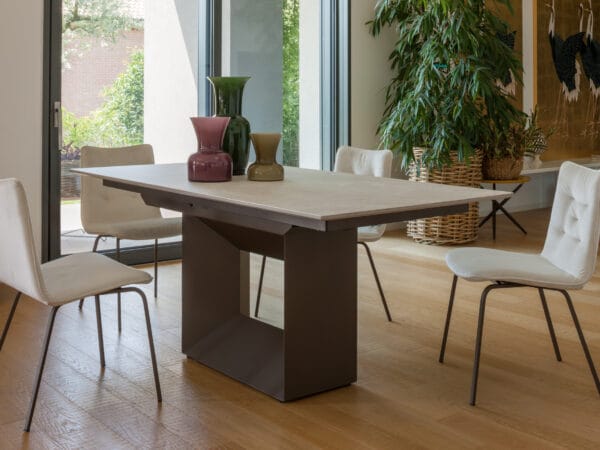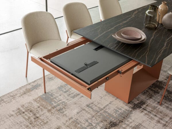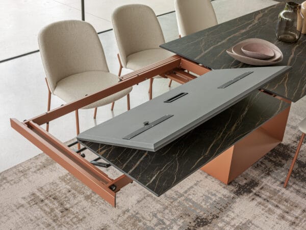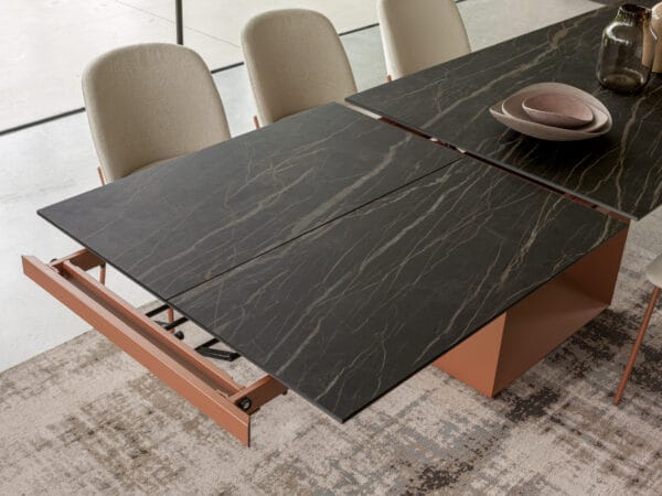 The ceramic top of the Defense table slides onto the base and with a few simple movements the extension extends the available space. A precious ally for the current dynamic needs of furnishings.