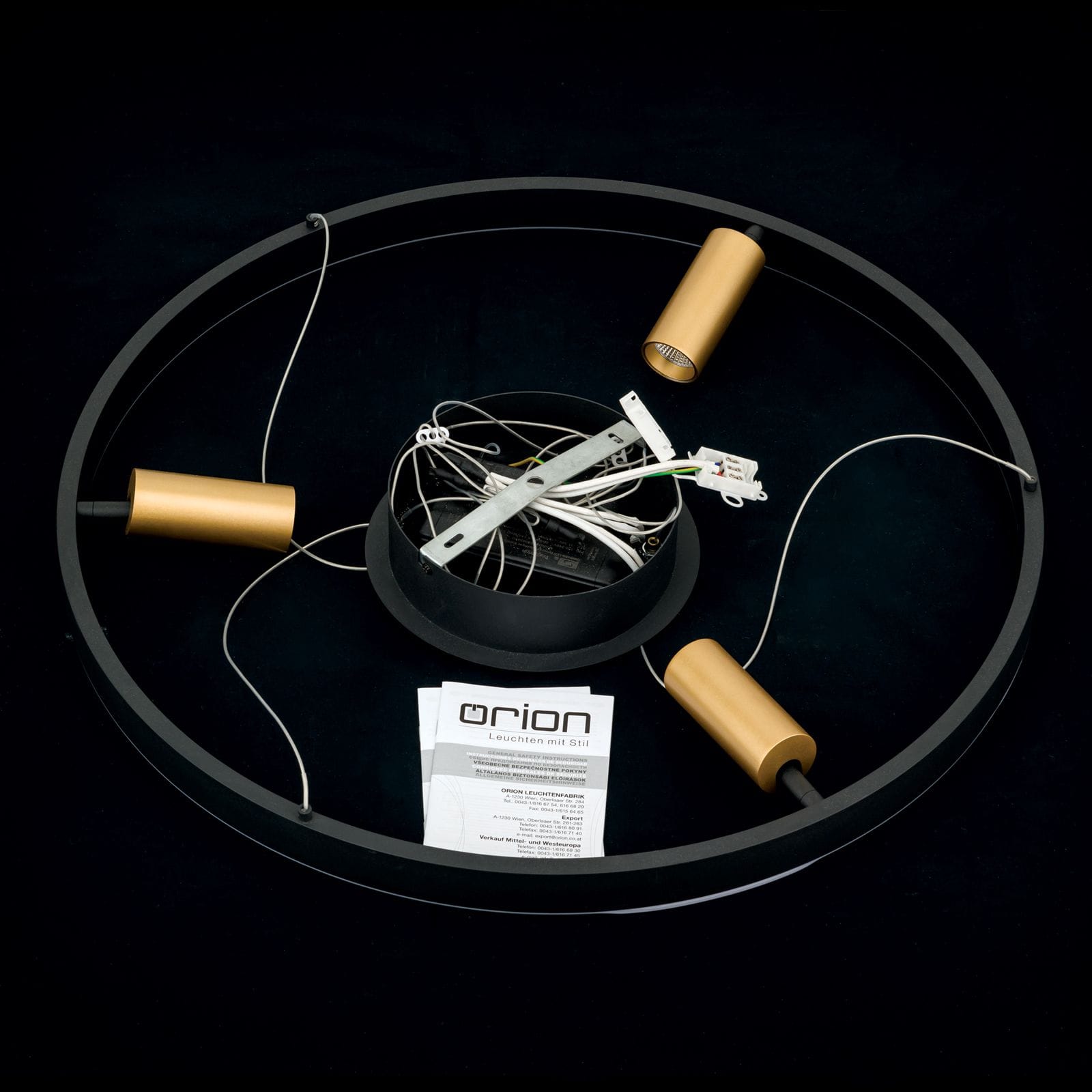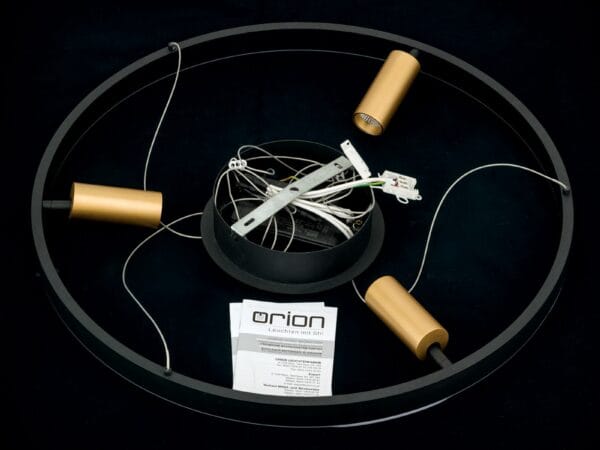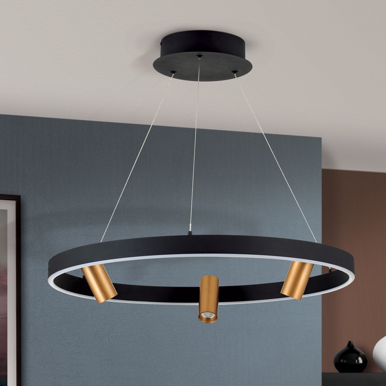 In addition, the pendant luminaire is equipped with three spotlights that can be aligned as required, allowing for pinpoint lighting. Whether in living or dining rooms, the lamp can be perfectly adjusted to room height and installation point due to the steel cables connected to the cylinder.