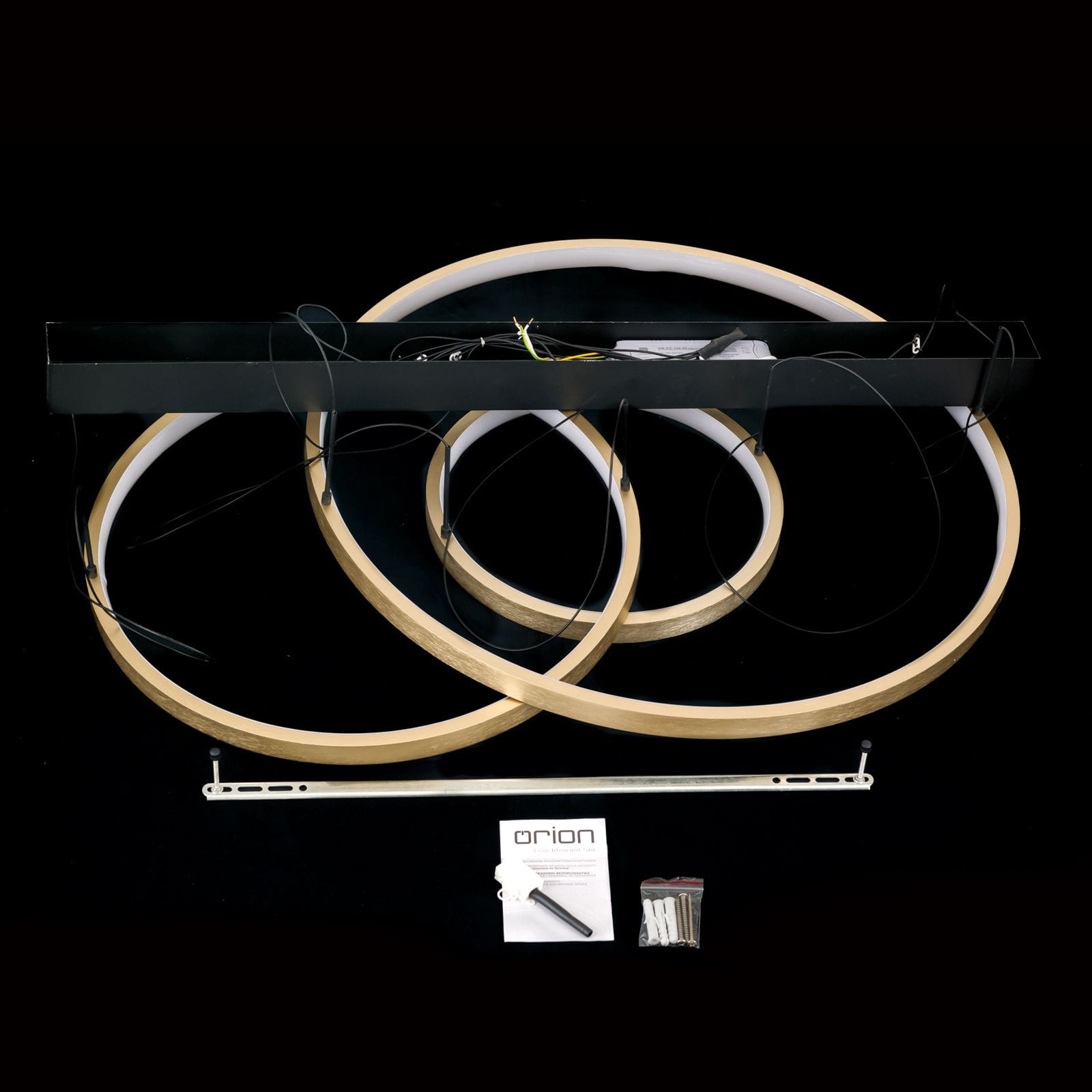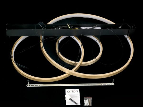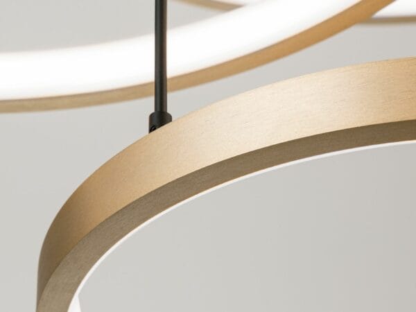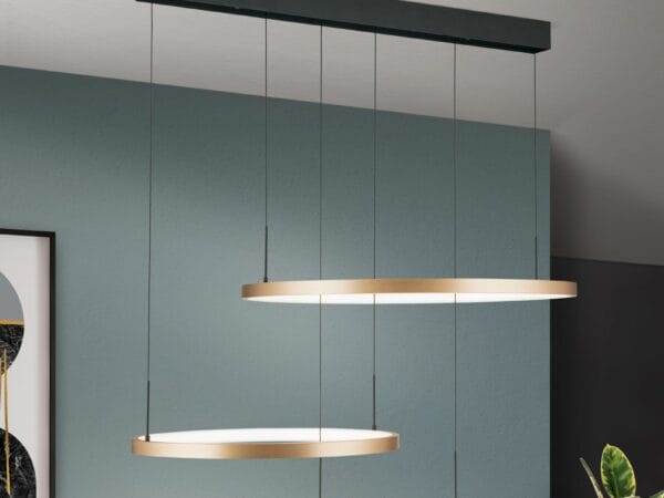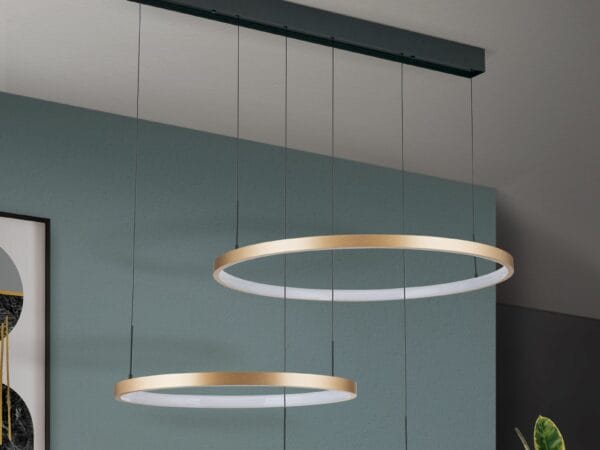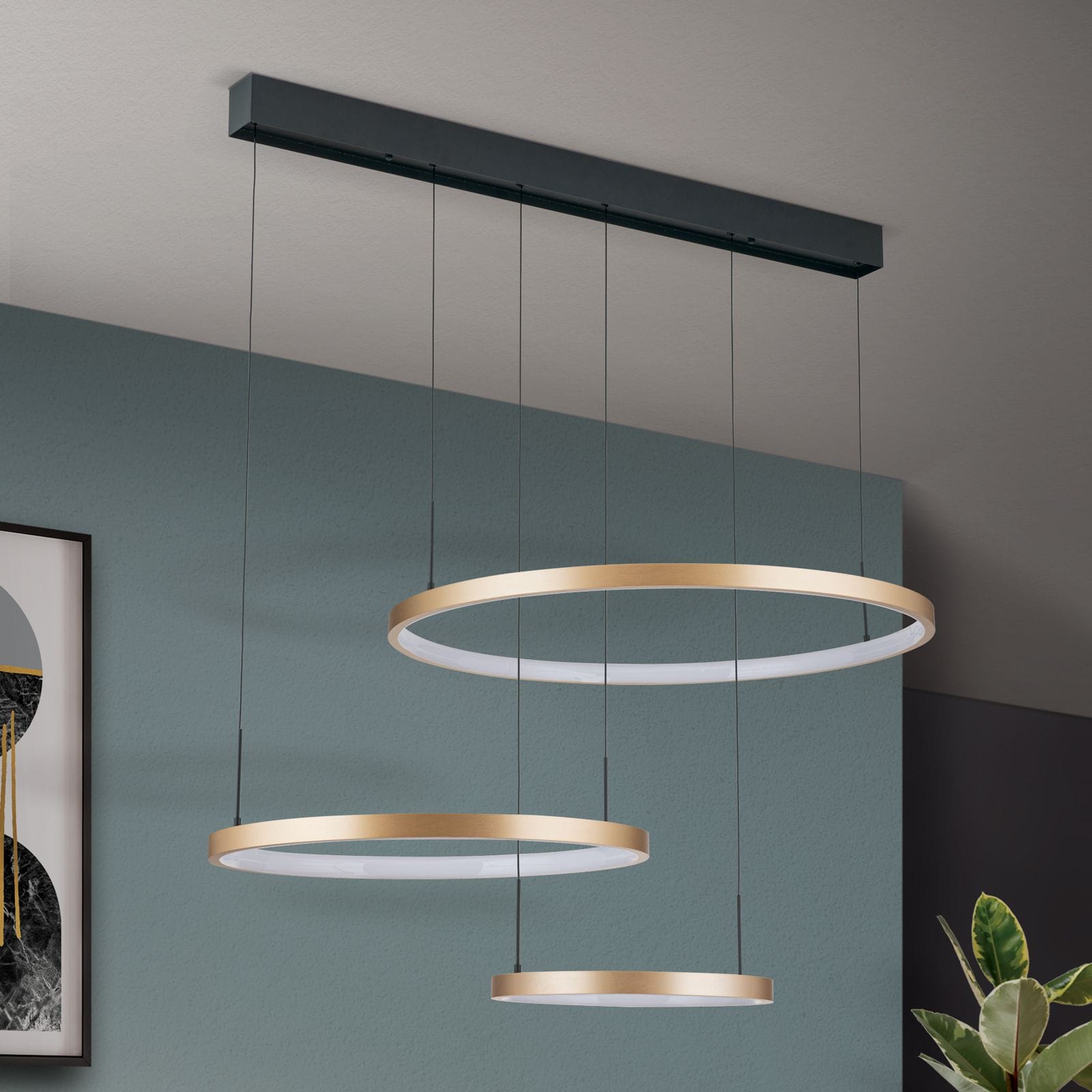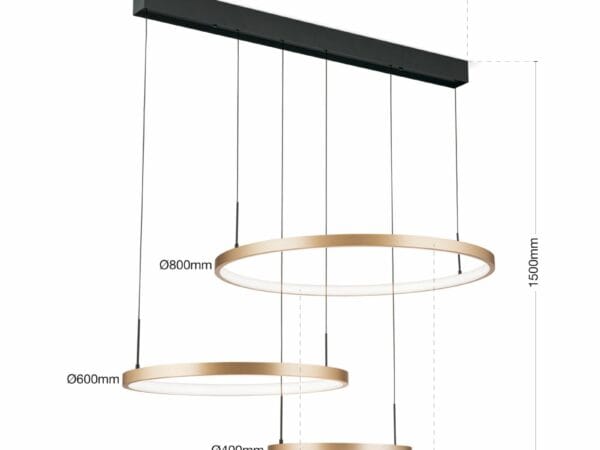 The SPHERE LED pendant lamp is an impressive example of modern design with classic and timeless elements. The black frame of the light is elegant and unobtrusive and forms a perfect base for the discreet black suspensions. Three gold-colored rings with diameters of 80cm, 60cm and 40cm float on these, captivating with their simple elegance.