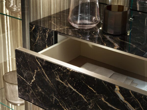 The Luce Dark dining room’s four-door buffet features a sophisticated black Portoro Gold marble finish on the sides and top, adding elegance to the design.