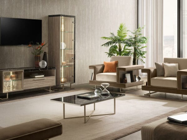What distinguishes the design of the side tables in the Luce Dark collection is their elegance, color contrast and minimalist style. A simple yet refined design that strongly matches that of its “big brothers” in the dining room tables, with which they share the same dark Portoro Gold marble finish and smooth, glossy top texture.