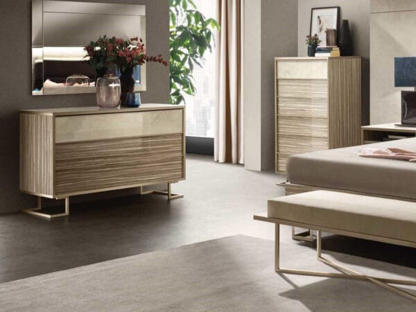 The dressers, available with 3 or 6 drawers, match the material-chromatic contrast between the “cold” Onyx marble finish and the “warm” Zebrano wood finish of all the bedroom furniture elements.