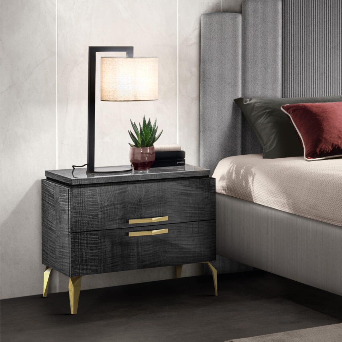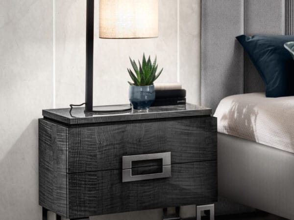 The compact and essential shape of the Moderna bedside tables fits perfectly into any space, and the smoky grey Sycamore wood finish lends refinement and elegance.