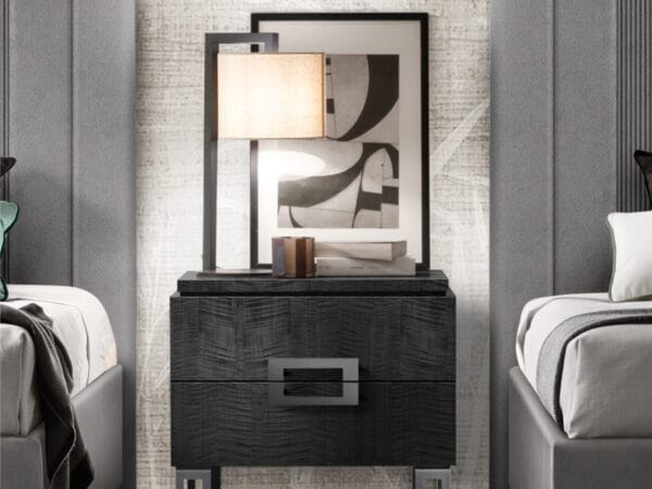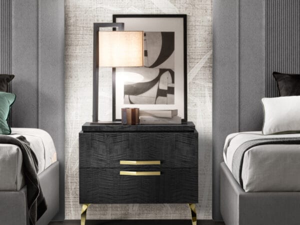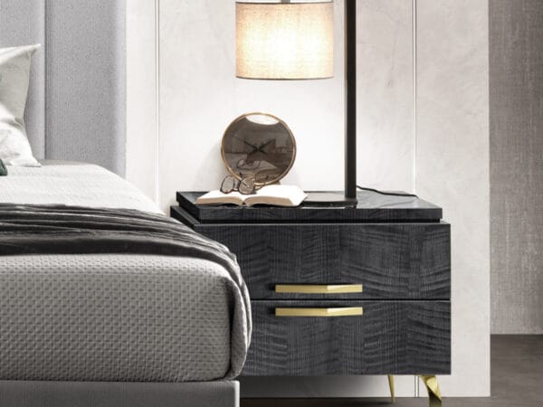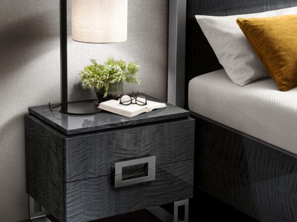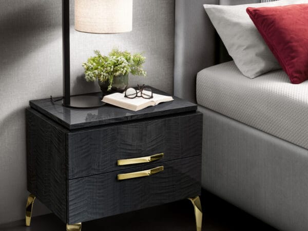 What makes the design of the bedside tables, the dresser and chests of drawers unique is the glossy black edged top detail, slightly offset from the body of the cabinet. This almost ‘three-dimensional’ effect creates a striking contrast of volumes and makes the overall view more dynamic.