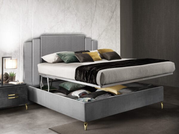 The upholstered beds in the Moderna collection stand out for their innovative and original design, in which the central striped fabric pattern is the most distinctive stylistic element. To the right and left of the central decoration, two vertical stripes of different heights rise up, creating movement and emphasise how the aesthetics are designed to catch the eye and enhance the bedroom.