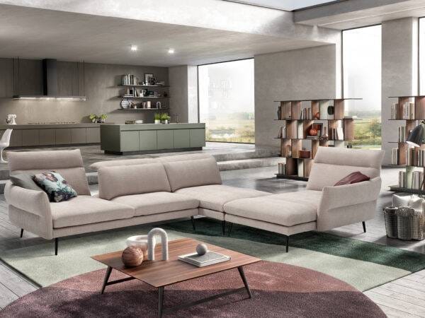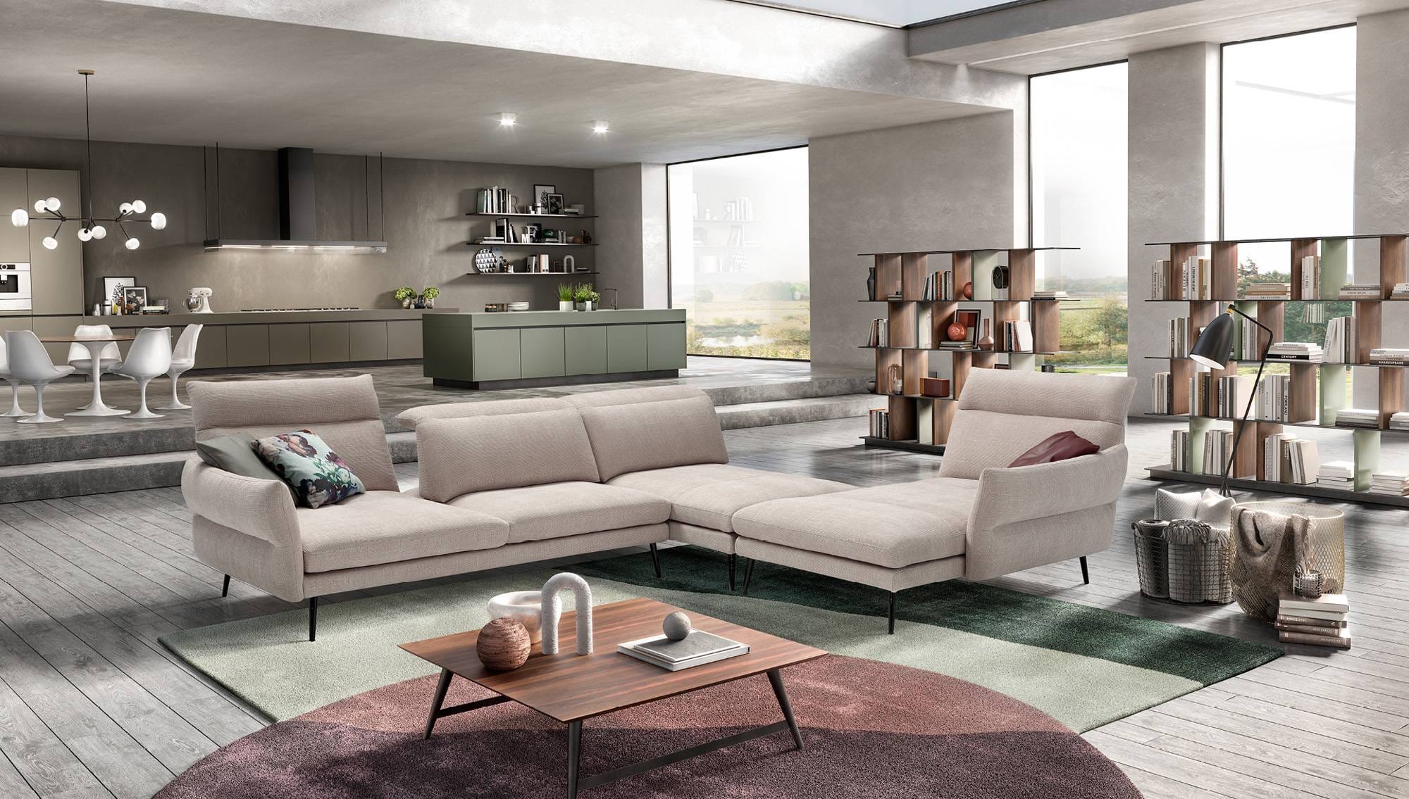 An expression of versatility and dynamism, the MODULA sofa, proposed here in a large corner version, is the result of a clever juxtaposition of modules.