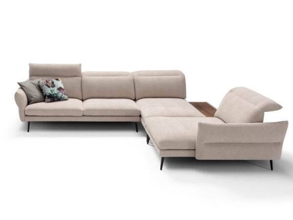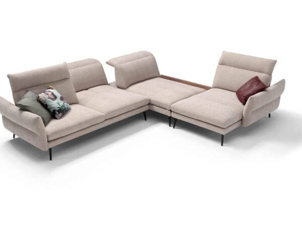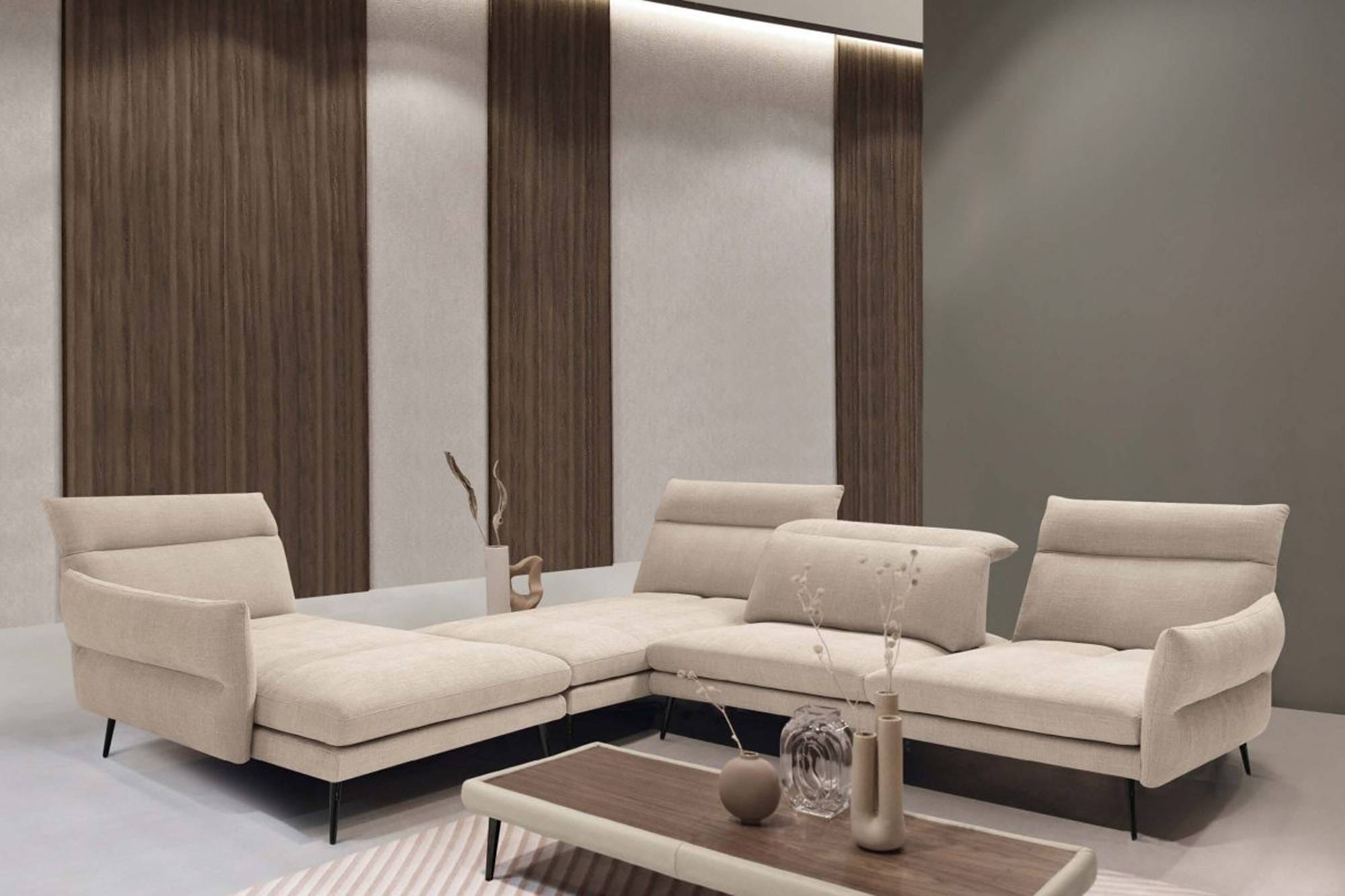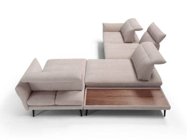 The model consists of a two-seater sofa combined with two chaise longues, arranged to create a right angle. The composition is closed by two armrests, embellished by the sartorial detail of the horizontal quilting. Finally, the functional coffee table finished in Canaletto walnut is an integrated accessory element that contributes to making MODULA the undisputed protagonist of the living area.