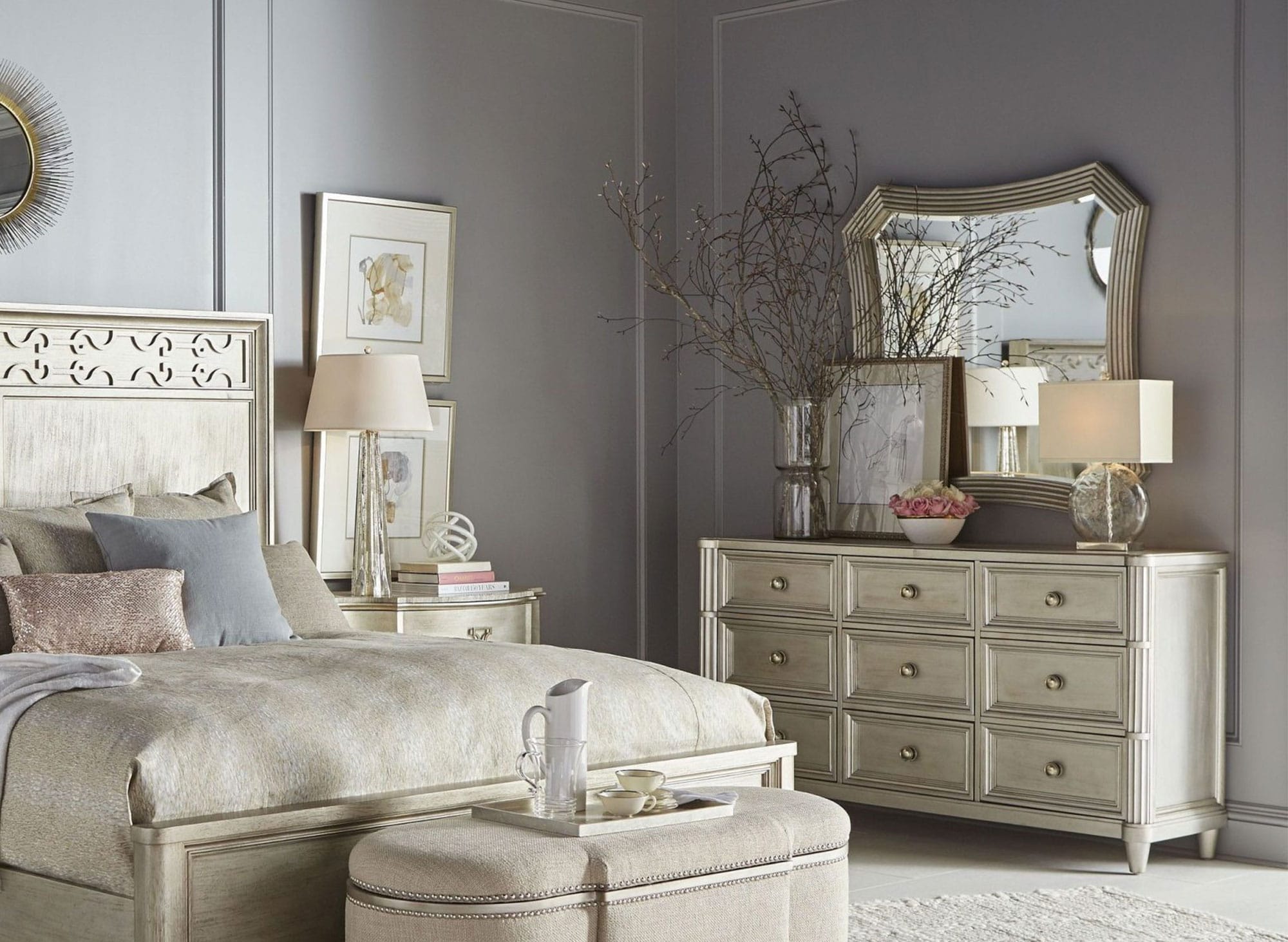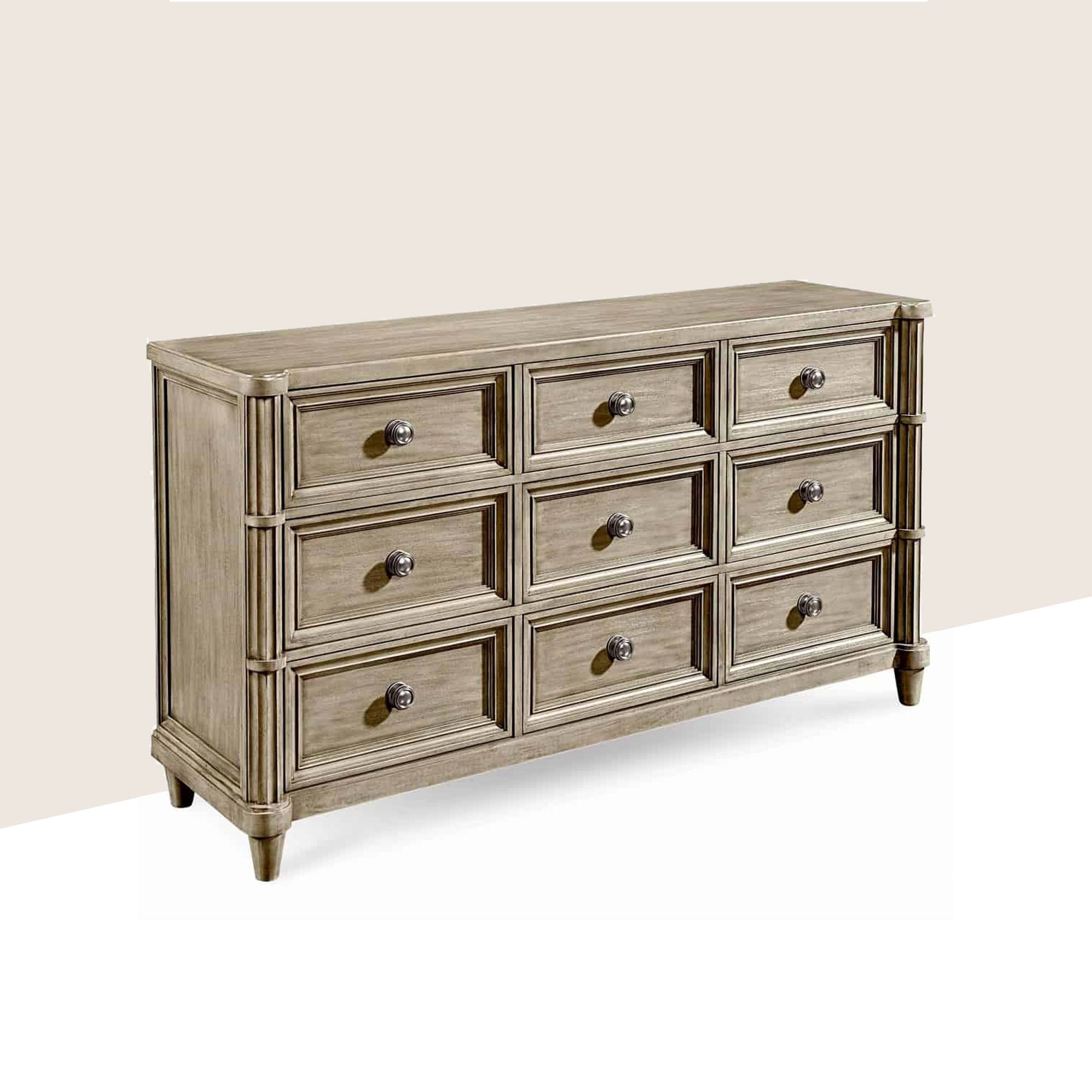The generously proportioned dresser has an architectural presence: the nine drawers are framed in box mitered molding and the two carved front corner are inspired by classical Roman fasces. The dresser, constructed of Parrawood solids and primavera veneers, is finished in a silver paint that has been gently glazed and aged.
