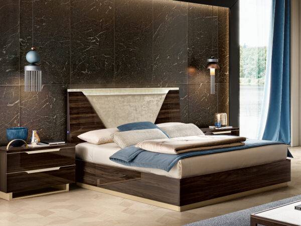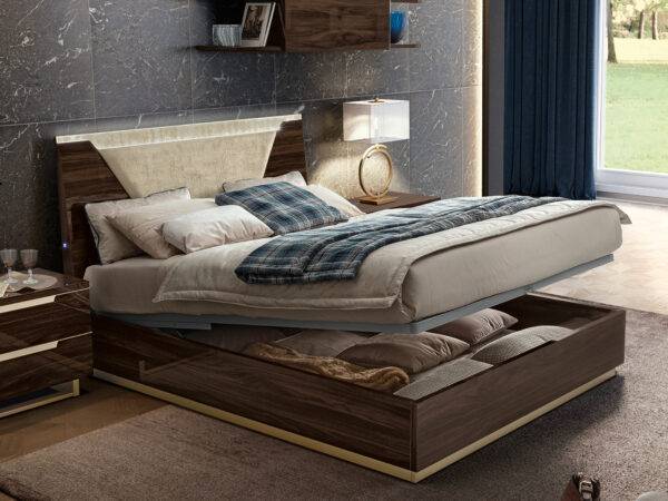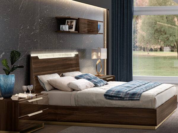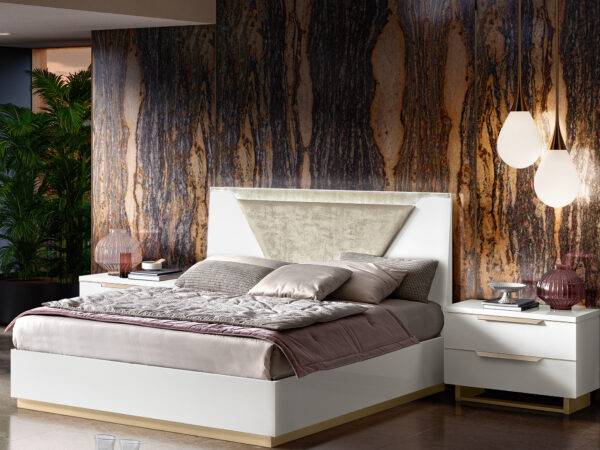 Attractive shining surfaces as well as the contrast between the structure of white high gloss lacquer and beige fabric of headboard. The handles and legs of this set are finished in the gold mat. Smart modern bed’s main presentation factor is its ability to offer a versatile amount of optional accessories to customize your bedroom according to your taste. In stock, there are Queen Size and King Size beds, maxi nightstands, chest, and dresser. But these are not all the features of this collection. A natural appearance and bright accents will provide this collection with special attention.