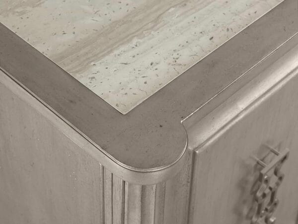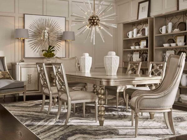 The collection’s unique appeal is based on gilded surfaces and details, bold designer curves, neopolitan marble, and chair upholstery with gold thread fabric.