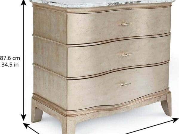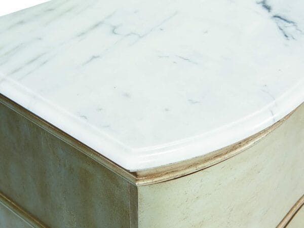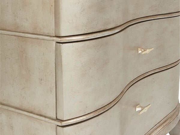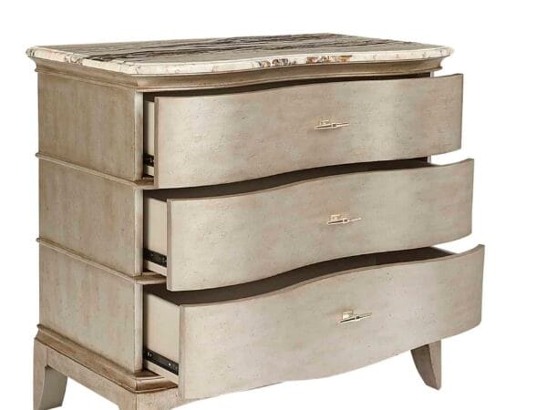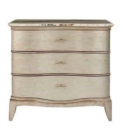 The handsome Starlite Bachelor Chest has three roomy drawers set into a gently curved serpentine front. The top of the chest is highly figurative polished stone; the body is finished with silver Bezel paint that has been glazed and gently aged for a soft sheen.