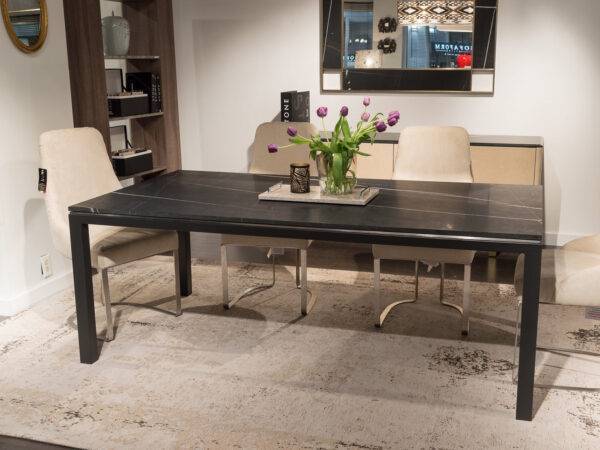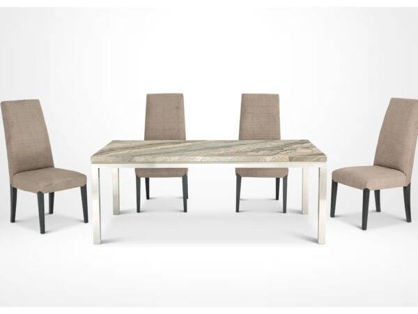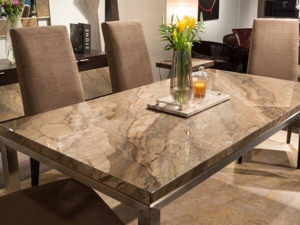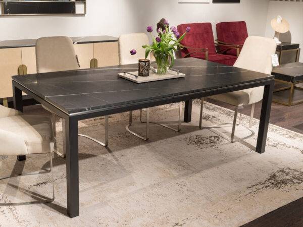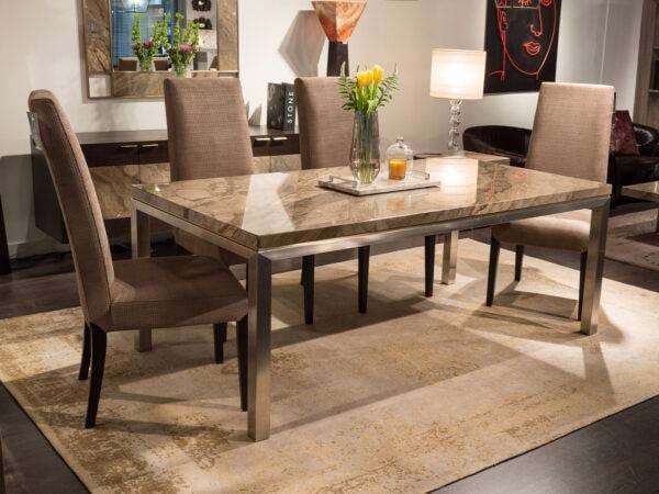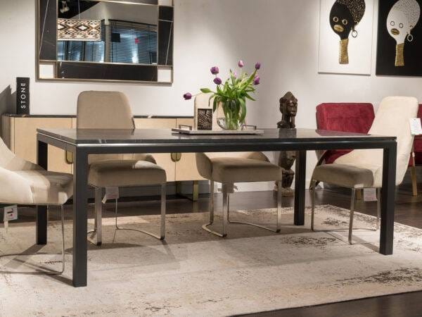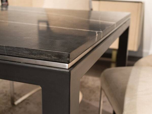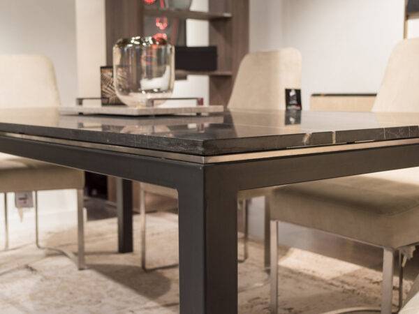 The Stilo collection is inspired to an iconic design of contemporary furniture: the Parson table, created by Jean-Michel Frank in the ’30s. This modernist table features four legs (square in cross-section), flush with the edges of the top, and equal to it in thickness. Today is enriched by a superb decorative trim placed just under the marble top and enhanced by a contrasting metal finish.