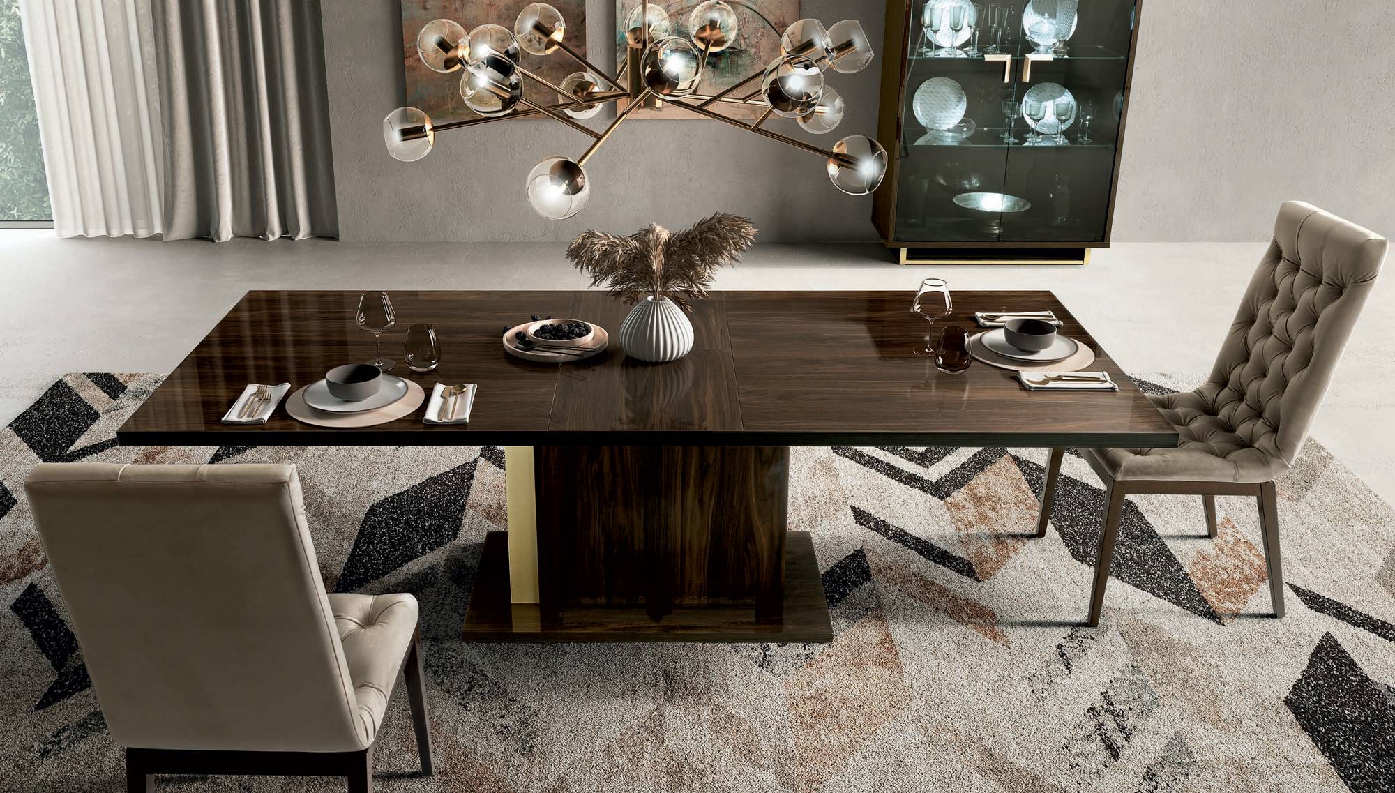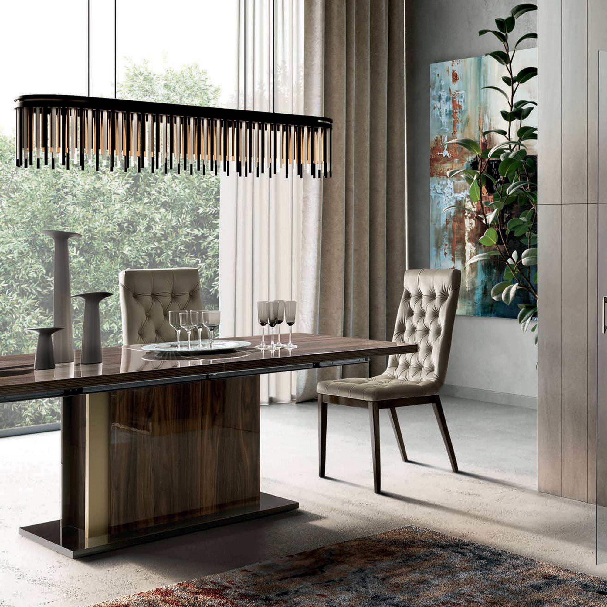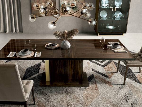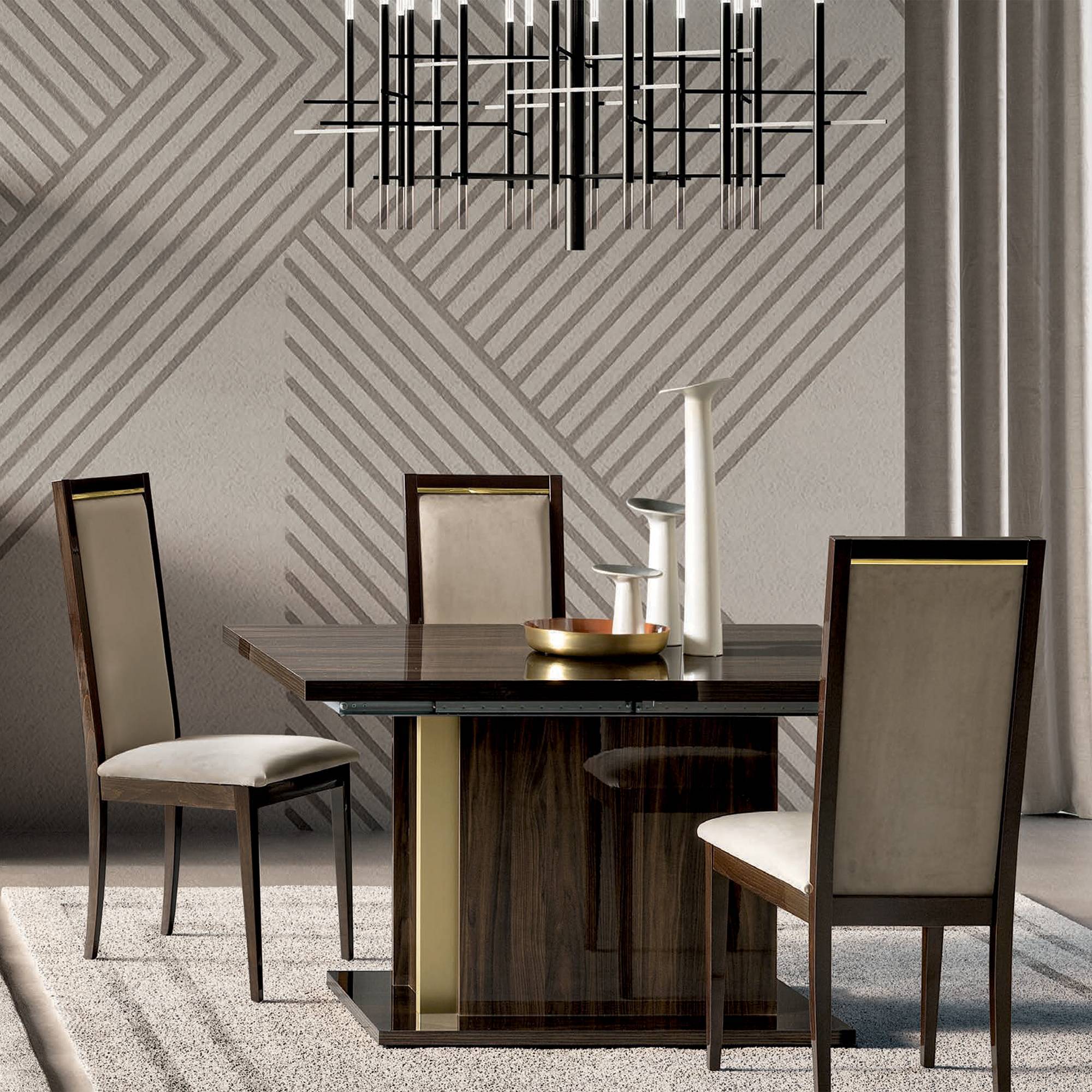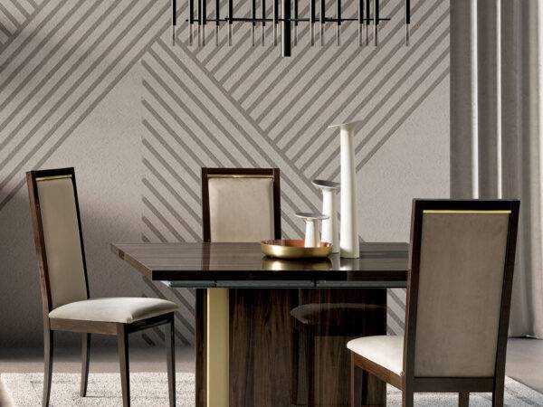 Warm shades of “Patrizio” walnut finish with streaked wood pattern give elegance and modernity to Volare collection. Original triangle cut handles in bleached, satin and brushed gold finish with matching plinths.