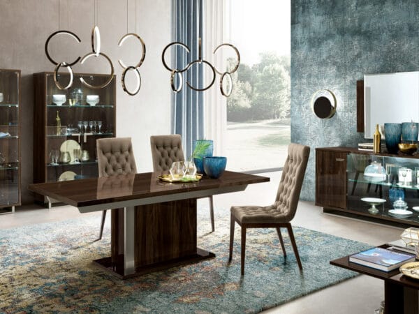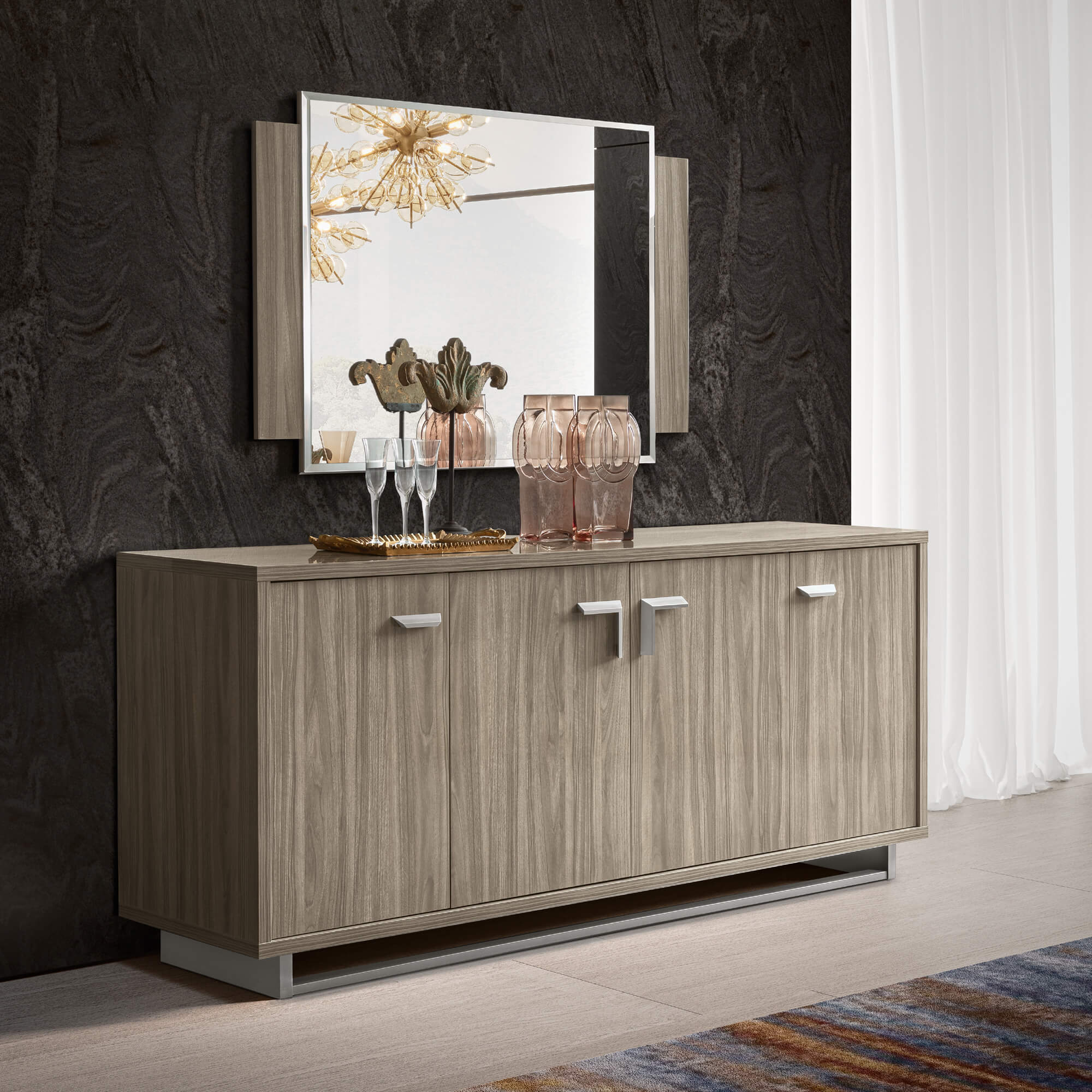 Լatest trend finish featuring chromatic combinations where the ash grey tones of elm gradually dim into alternating chiaroscuro shades which evoke the beauty of the Venetian Lagoon at the rising dawn. Functional and esthetically pleasing metal handles in satin, brushed and shining nickel finish. Also available with two central glass doors, internal LED warm light (3000°K) and 8 mm central glass shelf.