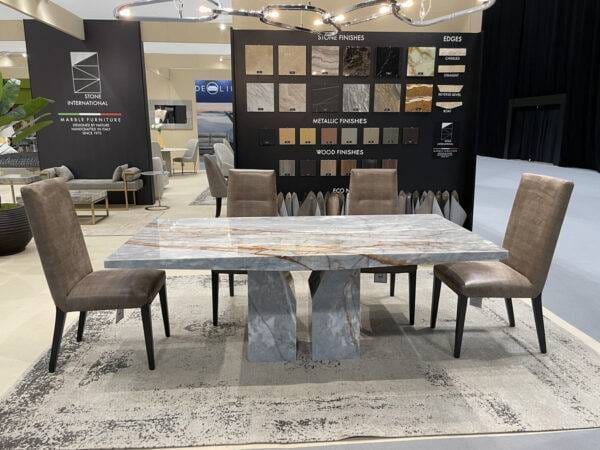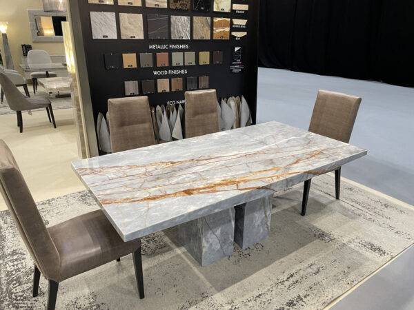 The Zenith Table Collection features a unique base design. The sculptural base is made by two vertical elements that fade from bottom to top. The marble natural veins  wrap around the legs and create a piece of art.