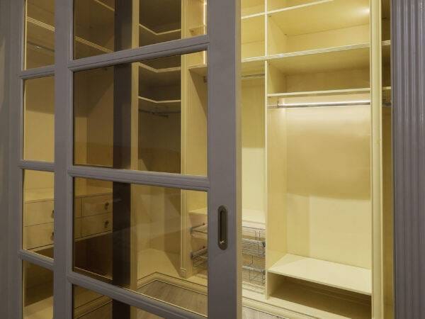 Гардеробная комната выполнена в современном стиле и отделена от спальни хозяев квартиры межкомнатными раздвижными дверьми купе.