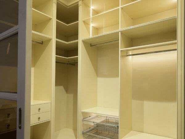 Если позволяют размеры комнаты, отличным решением будет организация гардеробной. Это можно сделать в нише, а некоторые выделяют для нее даже отдельную комнату. Гардеробная позволяет максимально эффективно и полезно задействовать пространство.