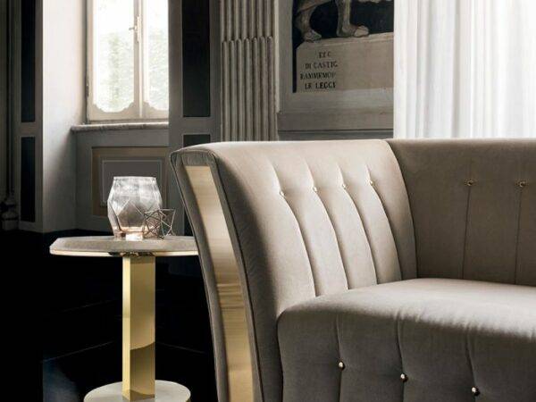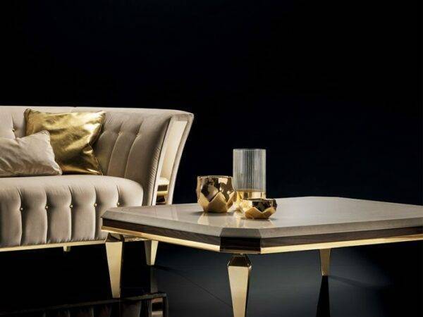 Интересно наблюдать, как простые геометрические угловые вырезы на столешнице придают журнальному столику из коллекции Diamante свой особый стиль. Тройные слои материалов и отделки, мраморная окраска столешницы, вяз и золото делают этот стол идеальным дополнением в гостиной.