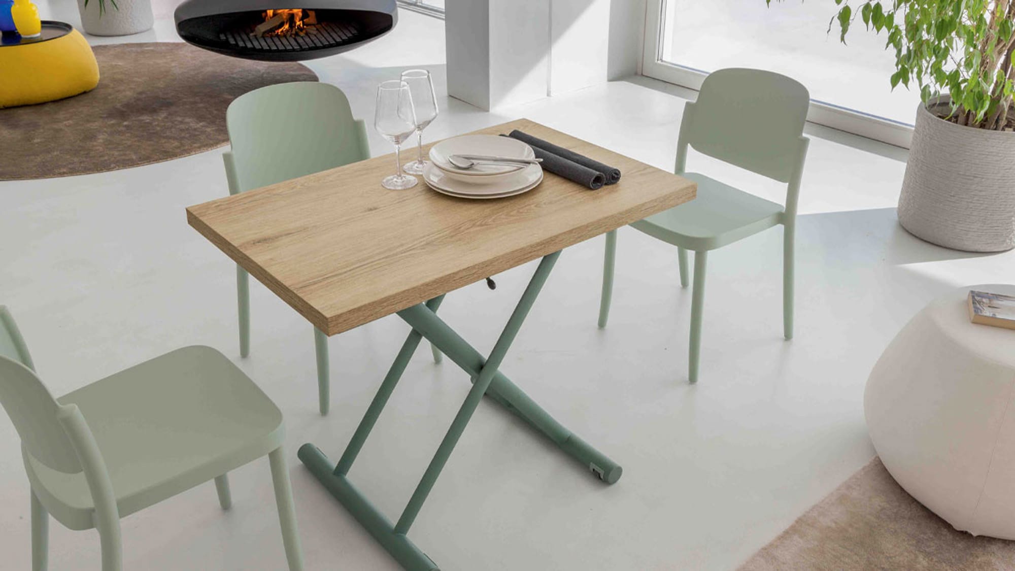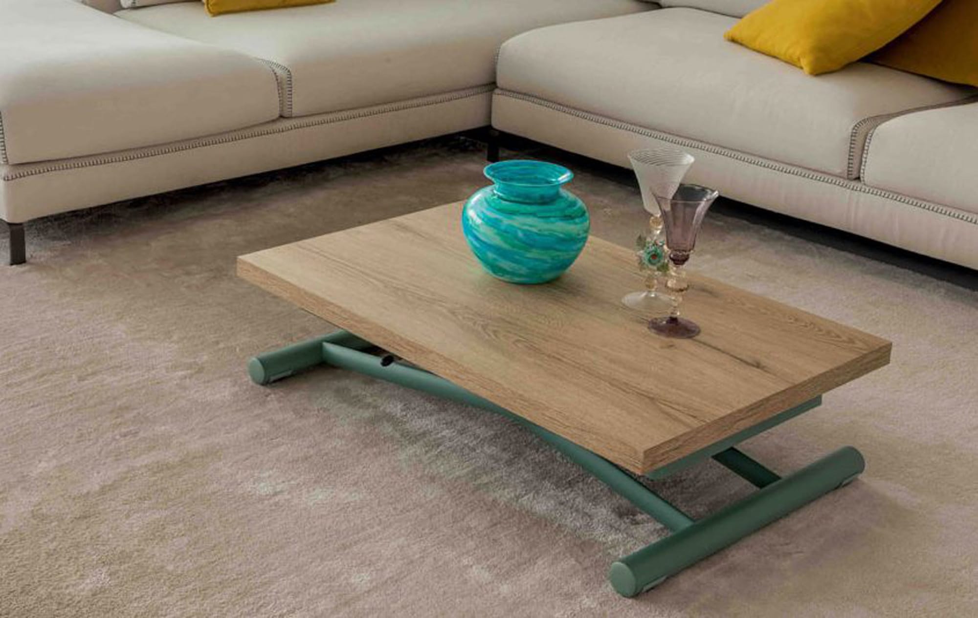 Амели — трансформируемый журнальный столик. Металлический каркас трансформируется в обеденный стол, газлифт, регулировка по высоте от 25 см до 76 см, двойная столешница из меламина, стекла, гипса, керамики. Базовые колеса.