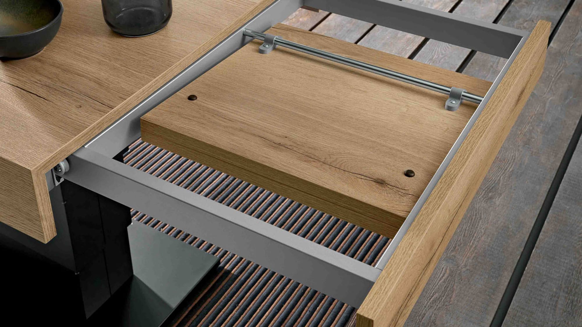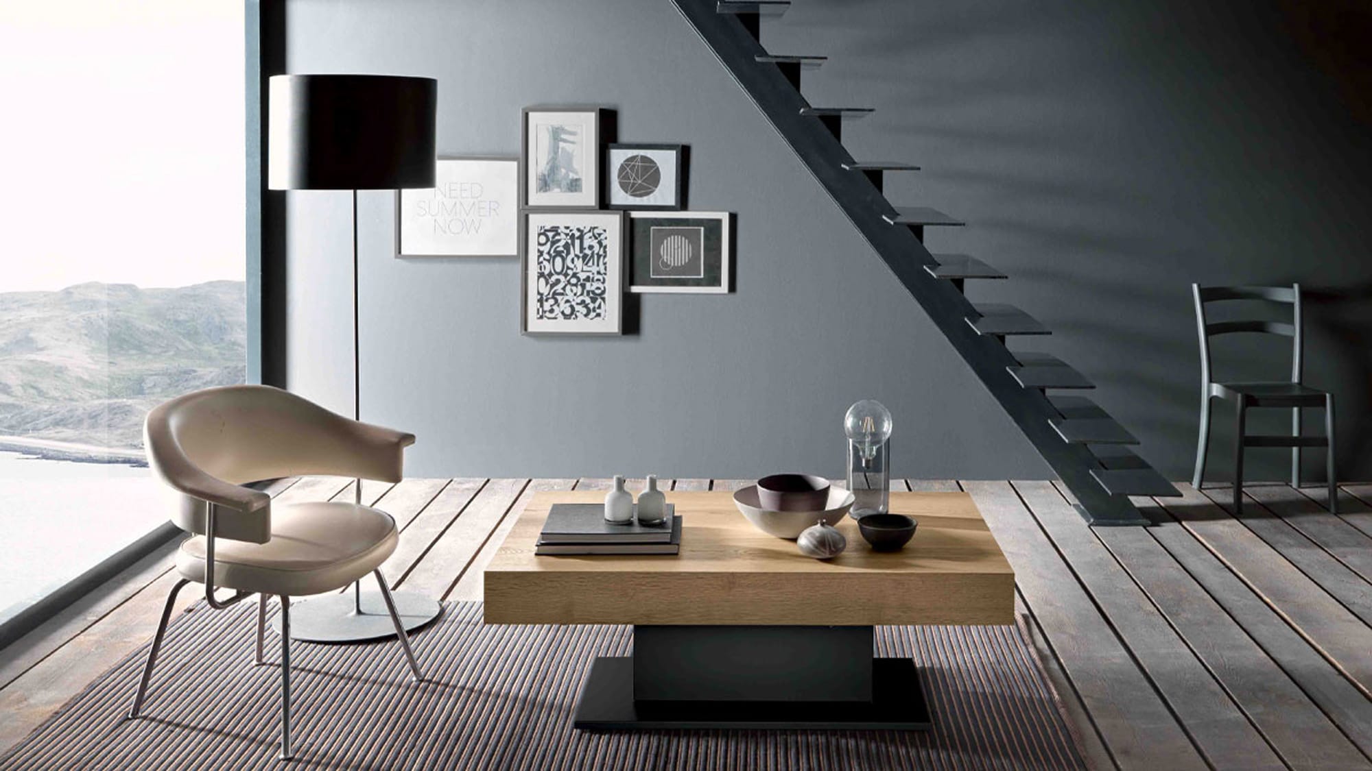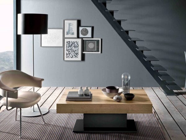 Журнальный столик-трансформер, трансформирующийся в обеденный стол, стальная центральная колонна, газлифт, регулировка по высоте от 41 до 82 см, меламин, лак, крашеное дерево, прямоугольная столешница, 2 внутренних механизма выдвижения.