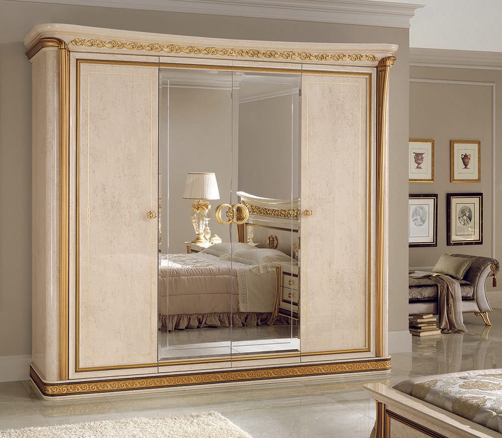 Чистота линий шкафа удачно контрастирует с изысканными деталями: фриз из золотой фольги, створки с деликатной сериграфией, резьба на центральном зеркале с драгоценной ручкой.