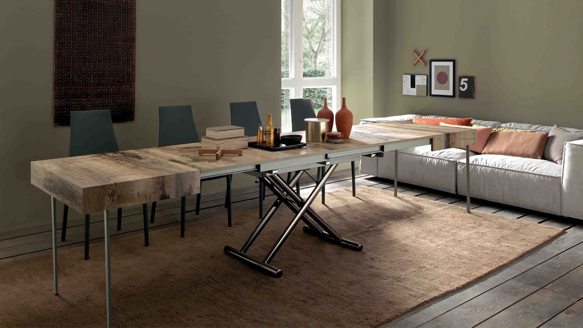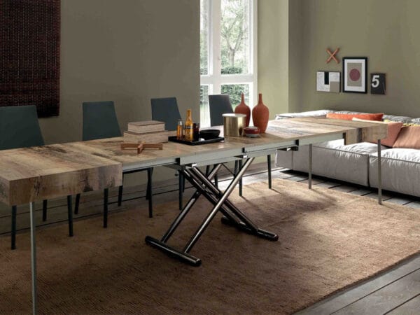 Журнальный столик с интересными функциями, который трансформируется в обеденный стол. Металлический каркас, газлифт, регулировка по высоте в миллиметрах 25-76 см, меламин, лак, прямоугольная столешница, 2 внутренних и 2 внешних механизма выдвижения. Базовые складные ножки.