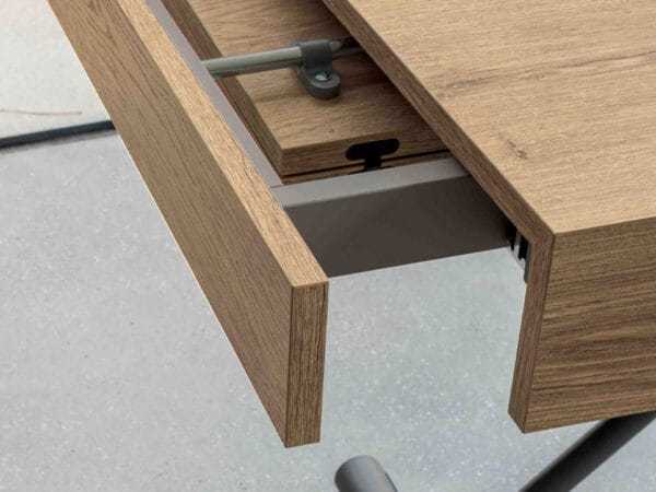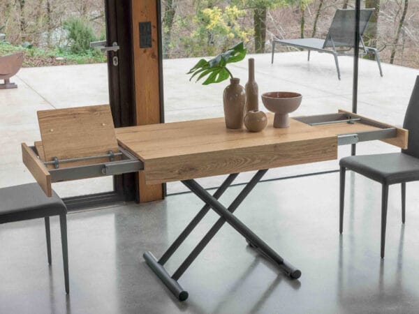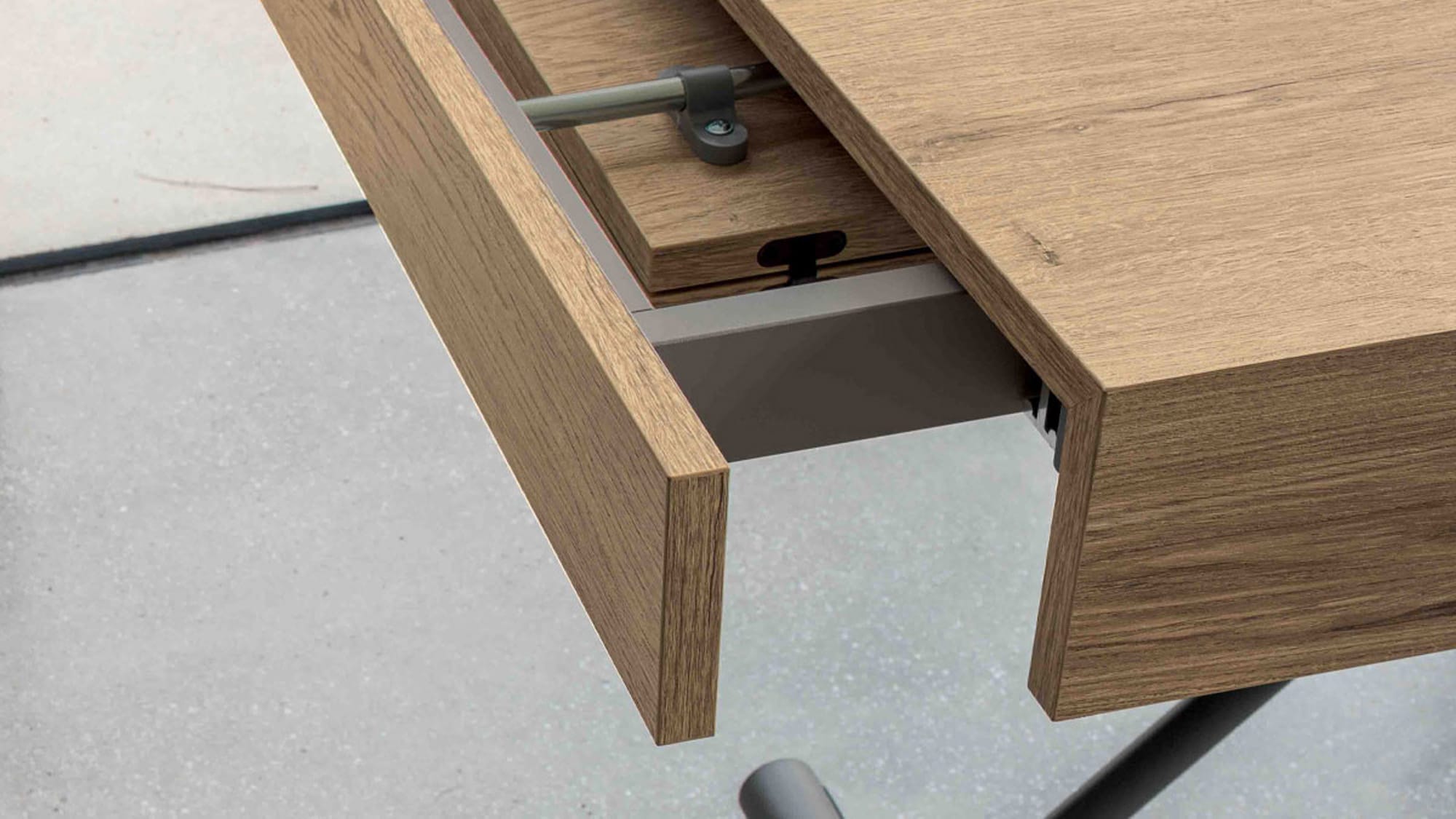 Одной из особенностей Compact является «Measuring up» с помощью складной системы расширения, которая позволяет расширять верхнюю поверхность в соответствии с функциональными требованиями и имеющимся пространством.Трансформируя журнальный столик, он превращается в обеденный стол. Металлический каркас, газлифт, регулировка высоты в миллиметрах от 25 см до 84 см, меламин, столешница из мореного дерева, 2 запираемых внутренних механизма выдвижения, опорные колеса.