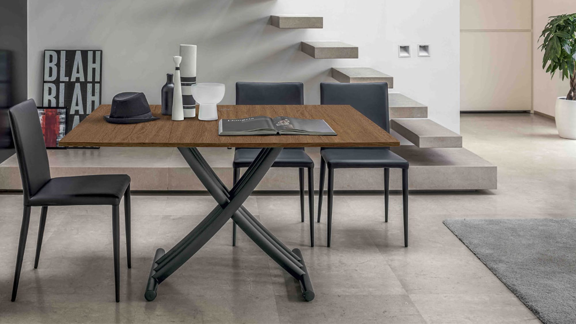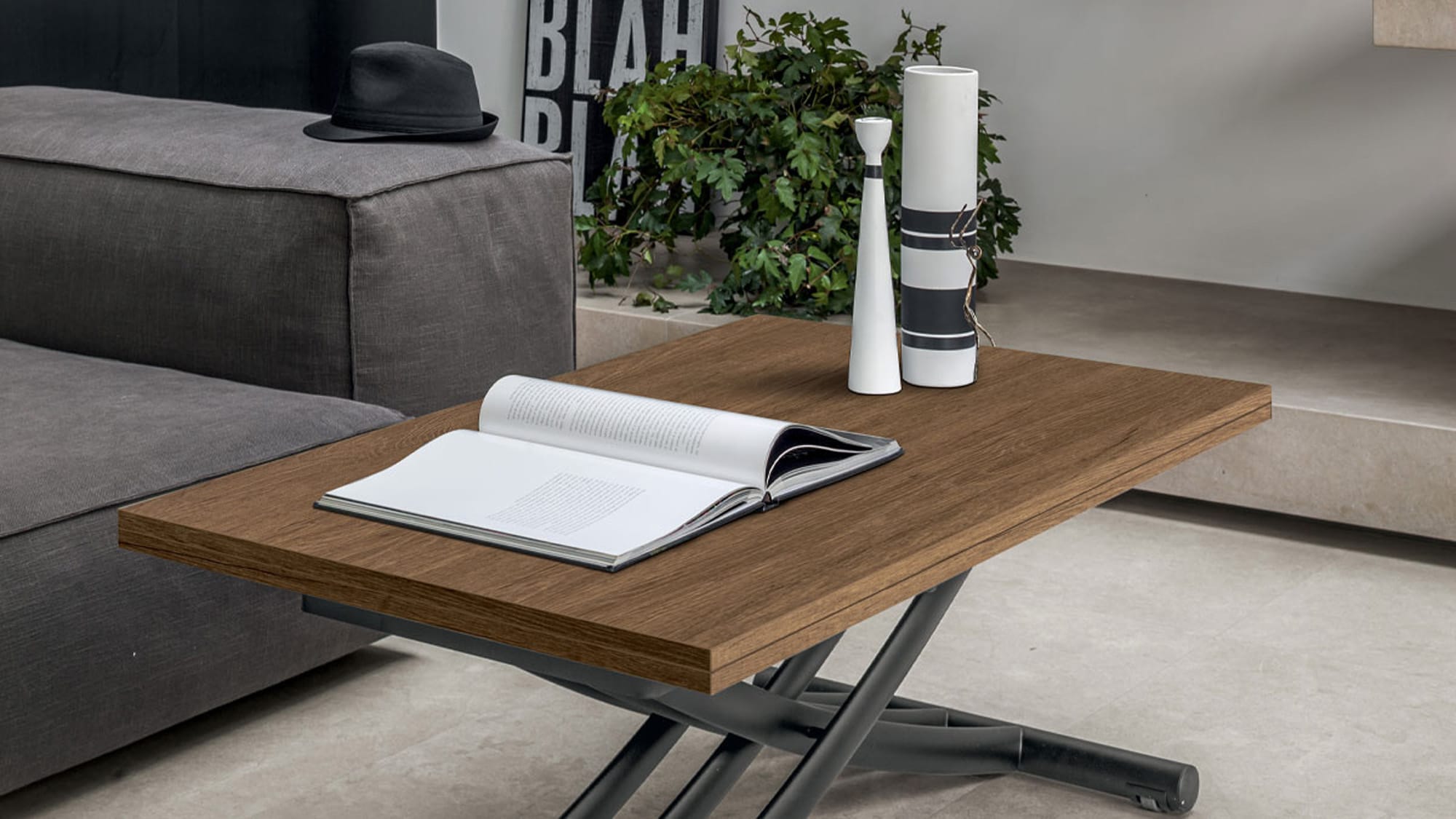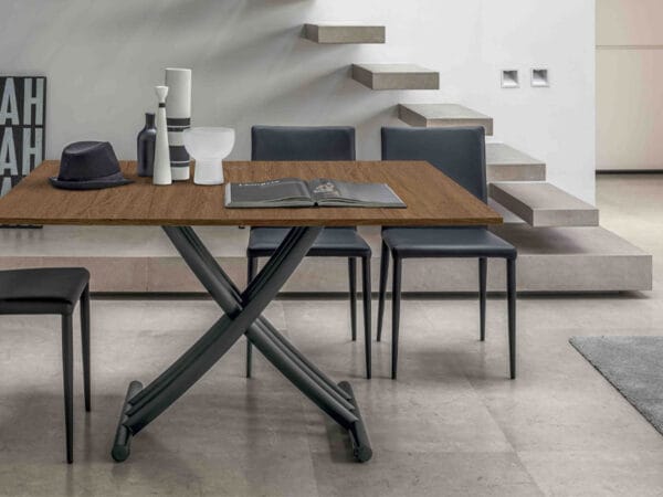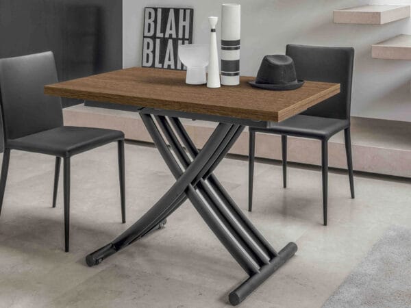 Fenice — трансформируемый журнальный столик, предназначенный для кухни и гостиной. Механизм регулировки высоты и ширины. Журнальный столик-трансформер на металлическом каркасе, газлифтом, регулируется по высоте от 22 до -77 см, двойная столешница из меламина, стекла, керамики, опорные колеса.