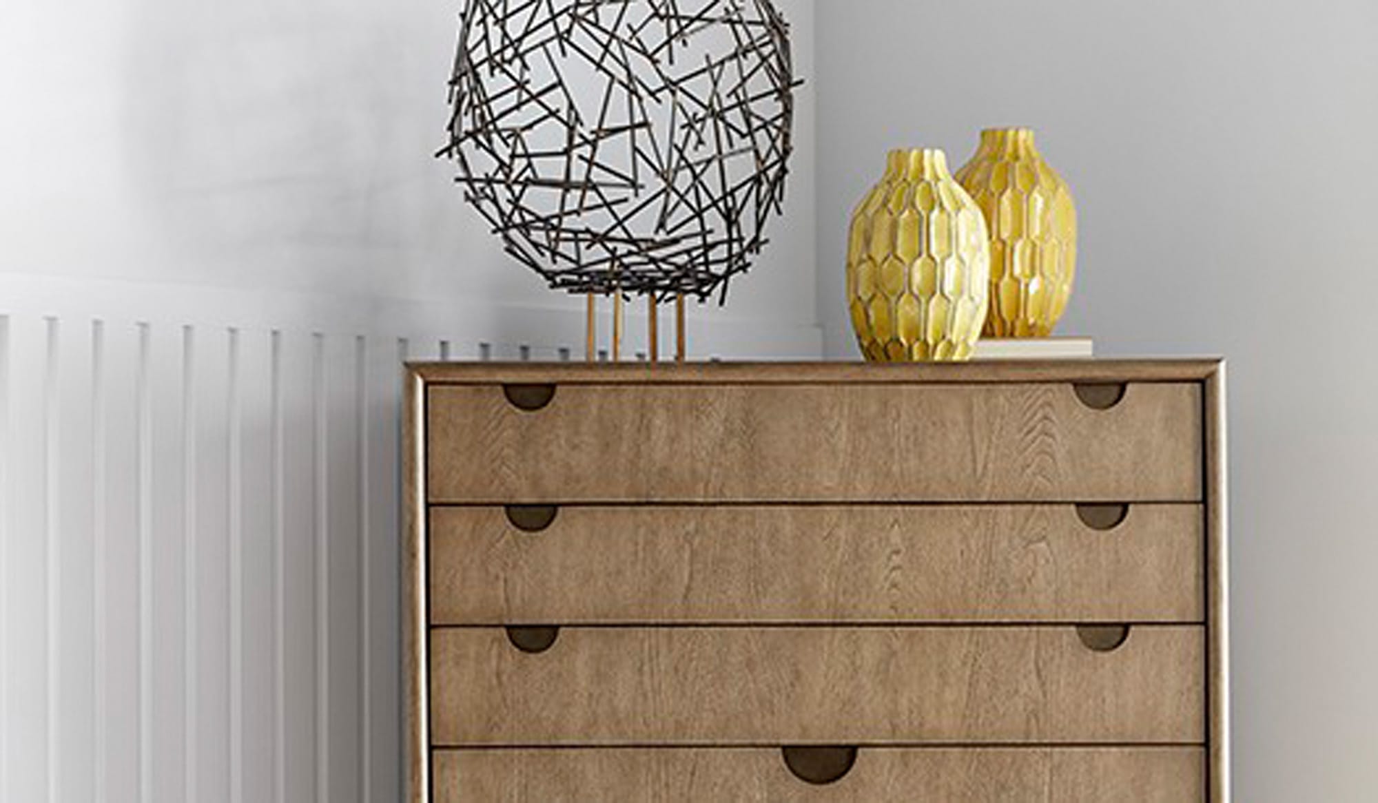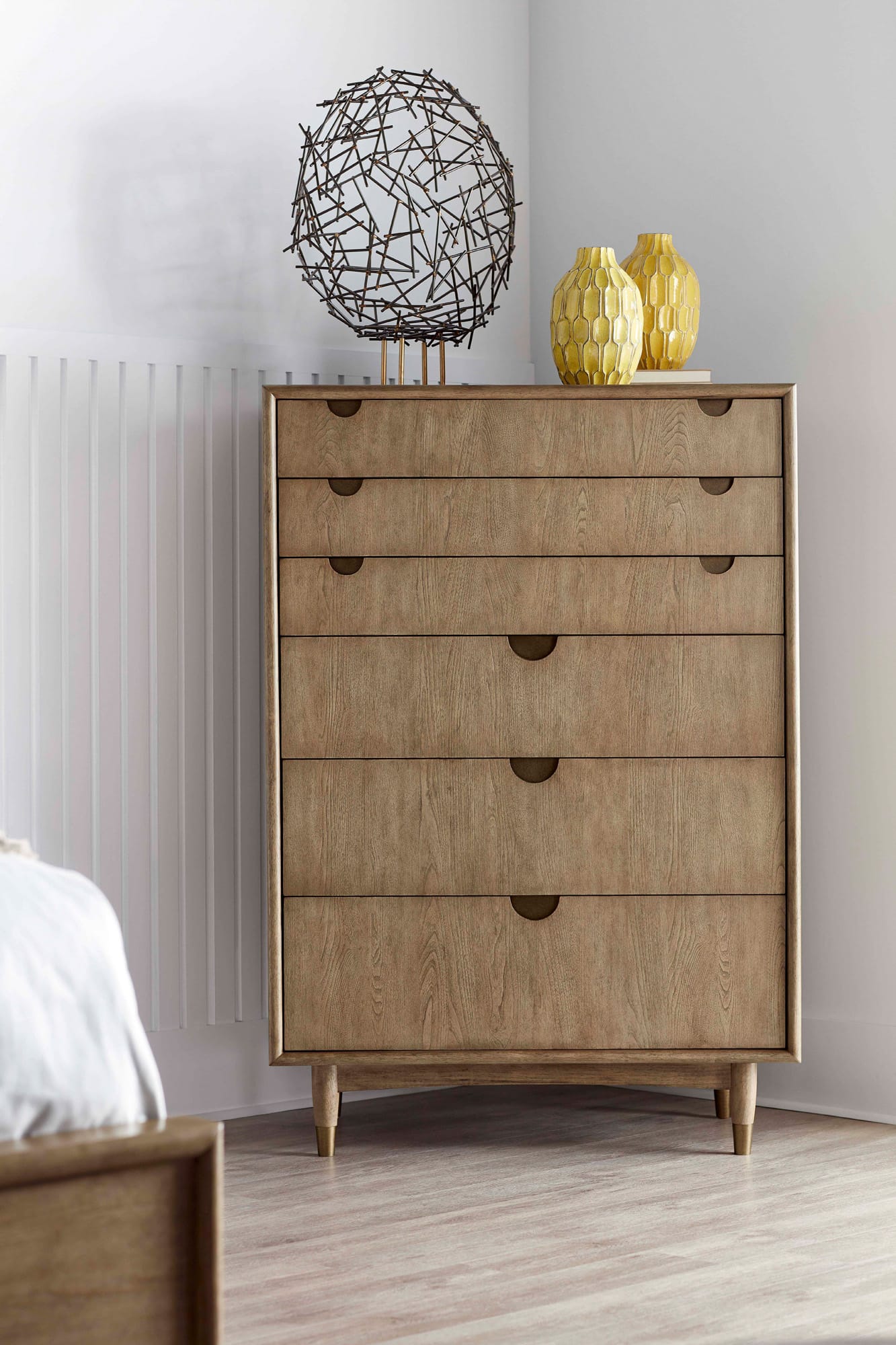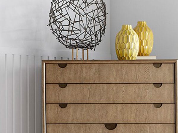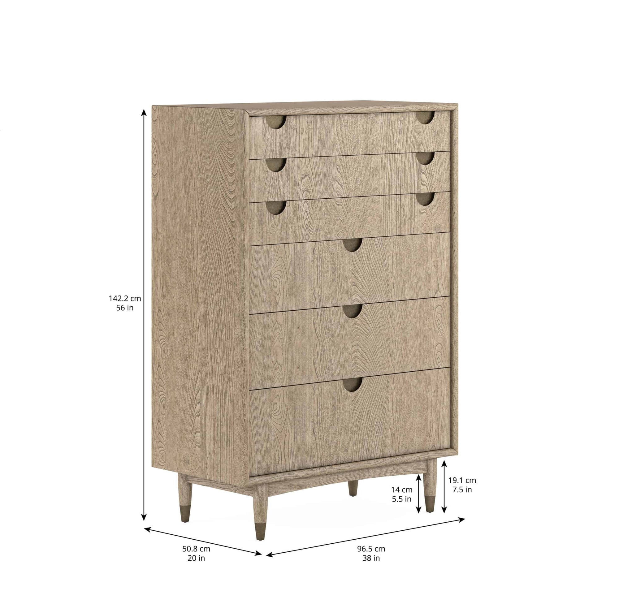 Выразительный стиль задает тональность для спальни с этим комодом из шести ящиков, легко сочетая форму с функциональностью. Его эстетика среднего века, вдохновленная Баухаусом, представляет собой гармонично сбалансированную геометрию с использованием повторяющегося узора кругов и полукругов, создавая образ, который является одновременно стильным и простым.