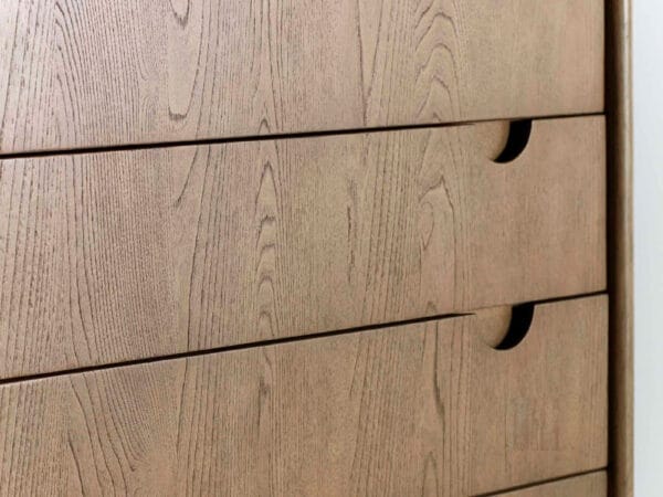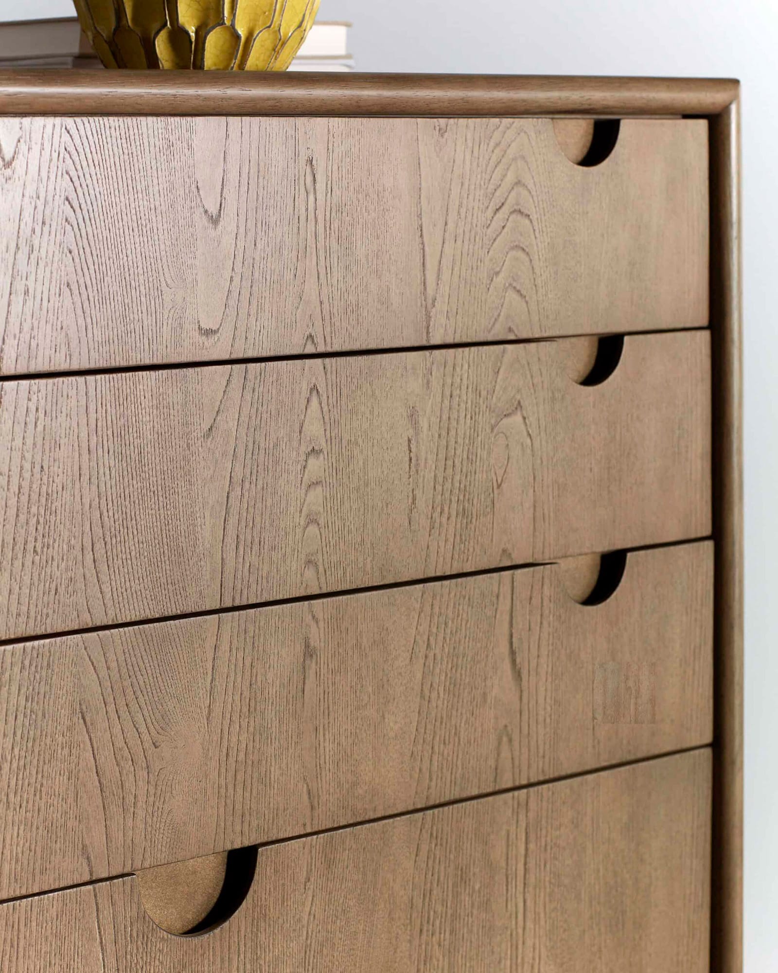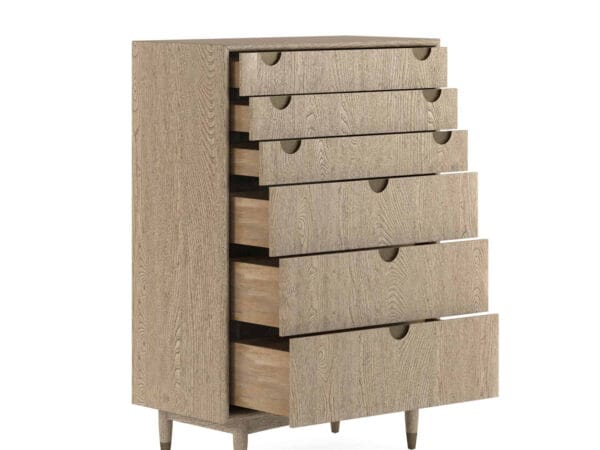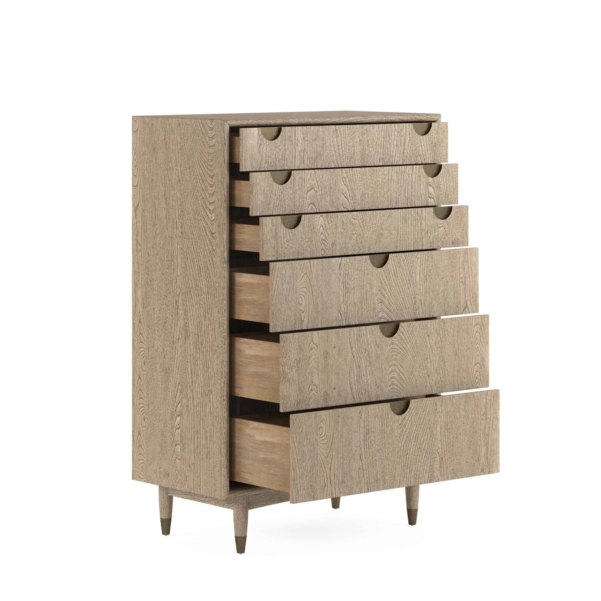 Выразительный стиль задает тональность для спальни с этим комодом из шести ящиков, легко сочетая форму с функциональностью. Его эстетика среднего века, вдохновленная Баухаусом, представляет собой гармонично сбалансированную геометрию с использованием повторяющегося узора кругов и полукругов, создавая образ, который является одновременно стильным и простым.