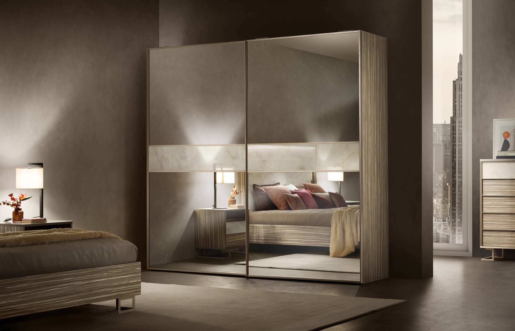 Элегантный гардероб Luce Light состоит из двух больших зеркальных дверей с использованием прочных алюминиевых профилей, которые скользят по направляющим с плавным закрыванием.