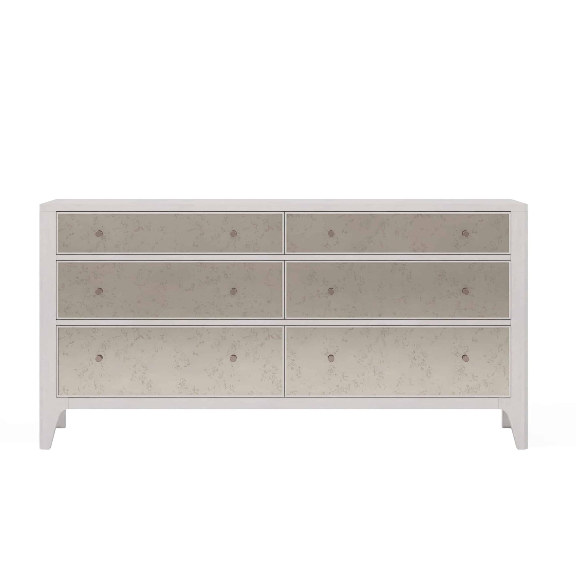 Классическая красота с современным акцентом является сердцем этой коллекции, что отлично демонстрируется в этом щедро пропорционированном комоде. Изготовленный из кленового шпона с отделкой в голубовато-сером цвете, шесть выдвижных ящиков идеально дополняются фасадами из состаренного зеркала, а нижние ящики обиты ароматным кедром.