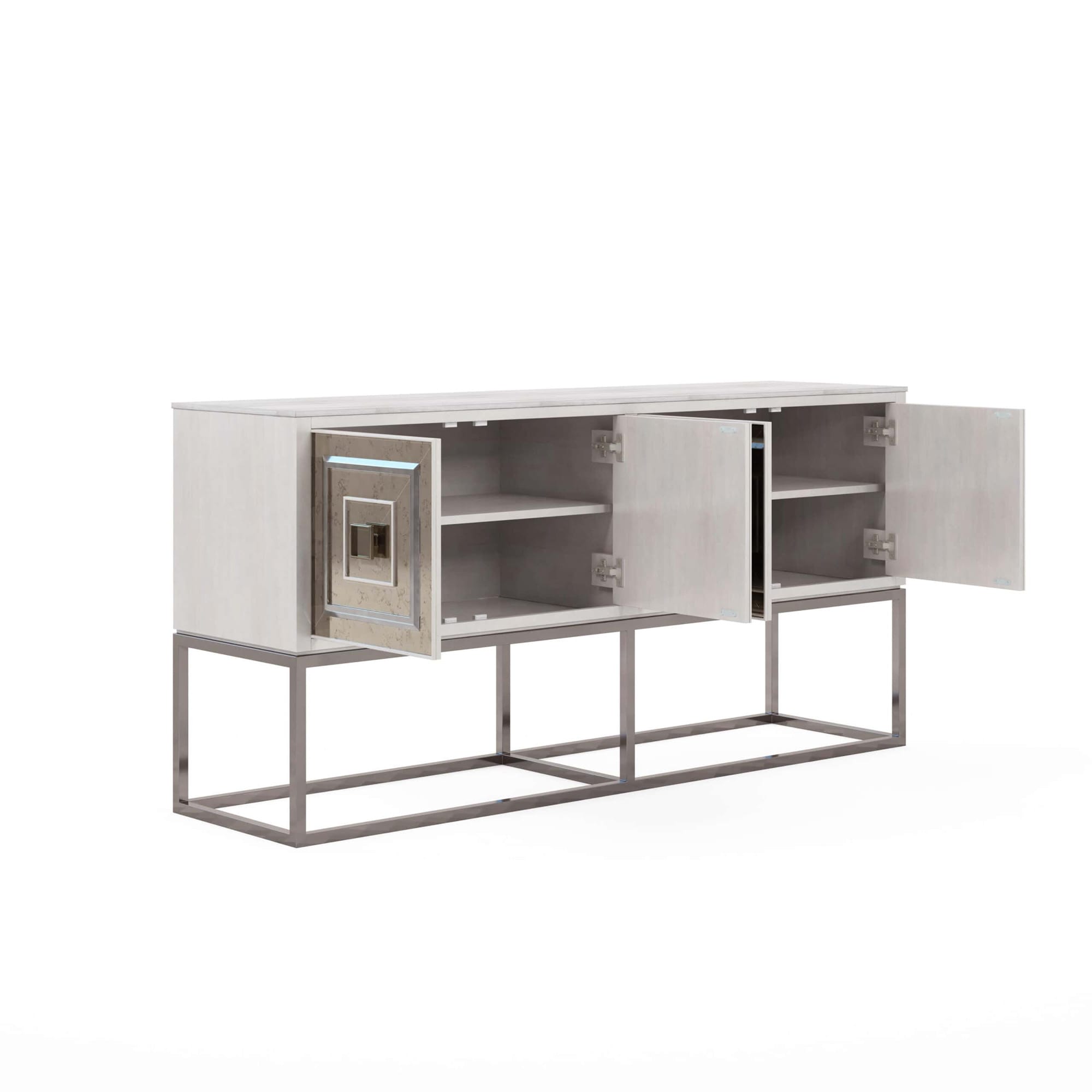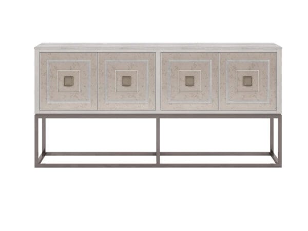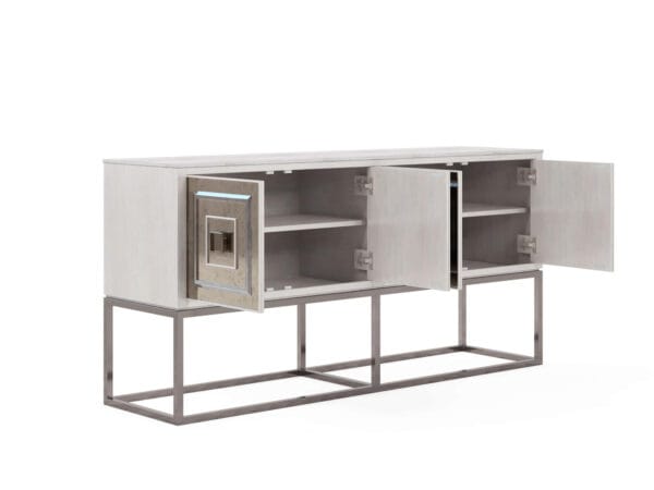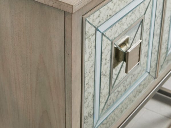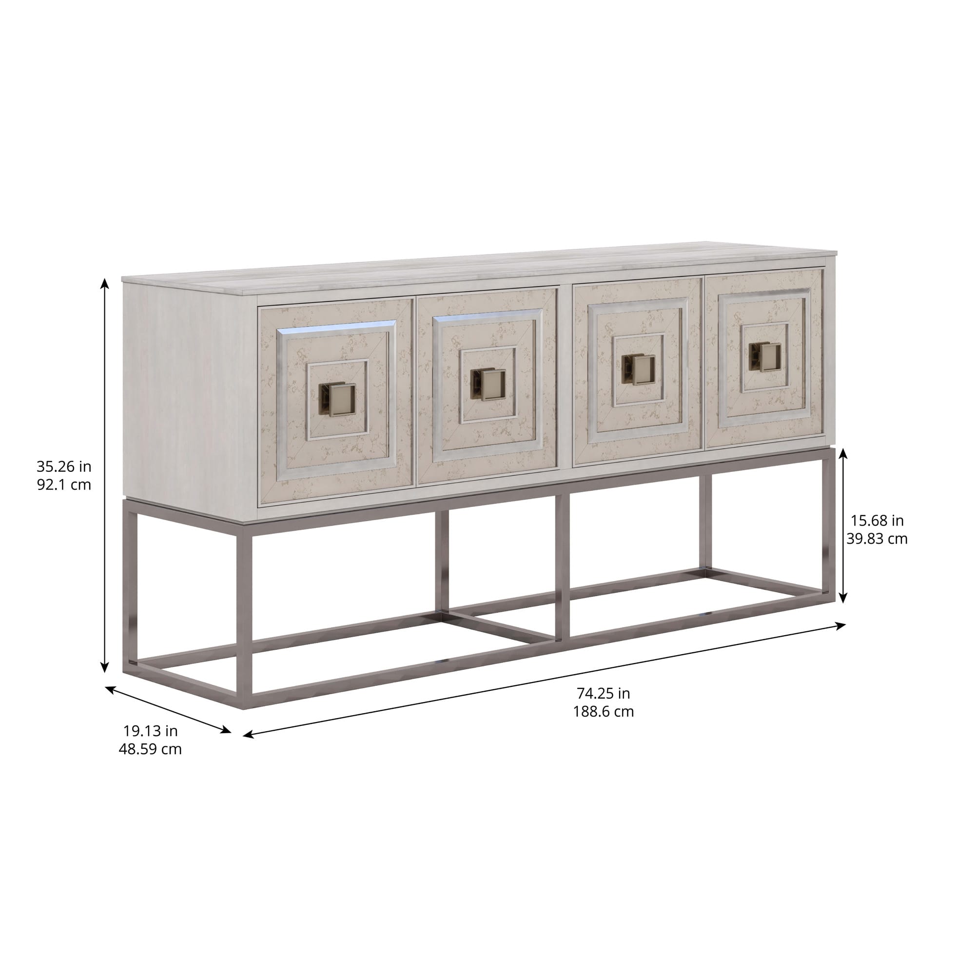 Эта привлекательная консоль удовлетворяет все ваши потребности в технологиях 21 века, сочетая в себе вдохновение винтажным стилем, напоминающим о культовом гламуре Парижа. Уникальная консоль представляет собой смешанные материалы, включая роскошную каменную столешницу, кленовый шпон с отделкой в голубовато-сером цвете, акценты из состаренного зеркала и открытую металлическую раму. Четыре дверцы скрывают две регулируемые полки и много места для хранения медиаустройств, аксессуаров и всех ваших других развлекательных необходимостей.