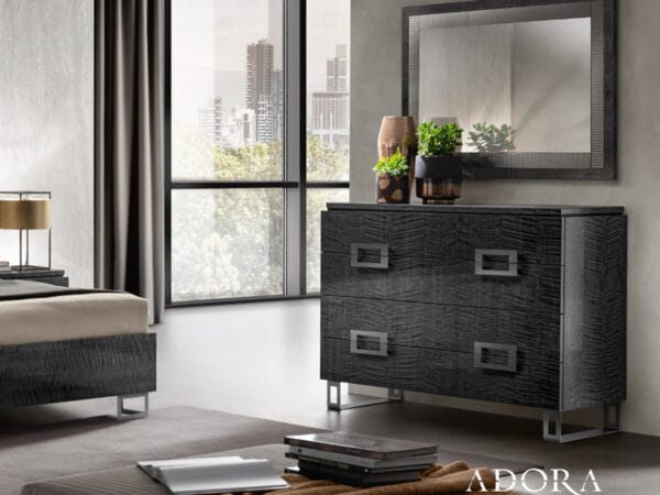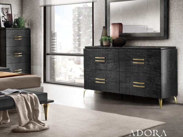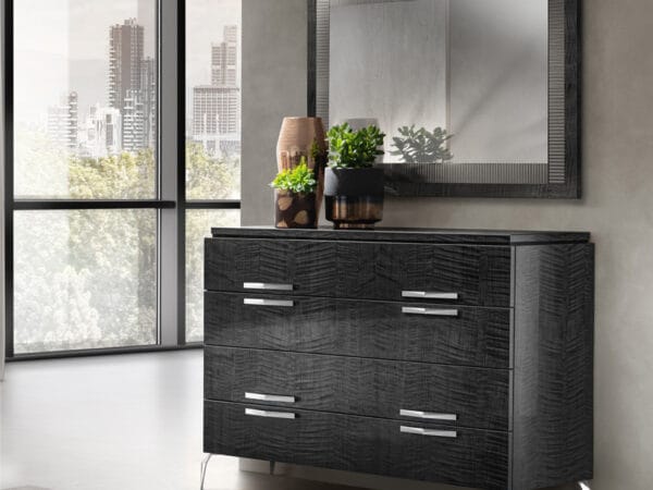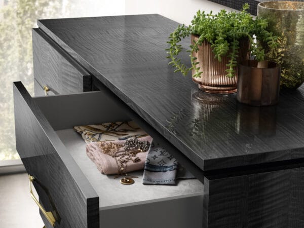 Комод Moderna, доступный в двух версиях (с 4 или 8 ящиками), отличается удобным механизмом плавного закрывания, гарантирующим плавное и бесшумное движение ящиков, а также обтянутым бархатом дном, создающим ощущение роскоши и комфорта.