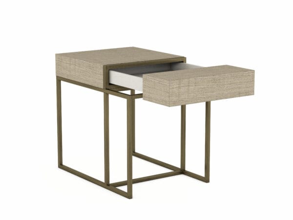 Современный и минималистичный дизайн таит в себе эстетически приятный сюрприз: столешница разделяется, открывая единственный ящик. Основание представляет собой легкую и воздушную раму, отделанную льняной бронзой, а массив паравуда и шпон ясеня имеют теплую светло-серую отделку в оттенке сланца.