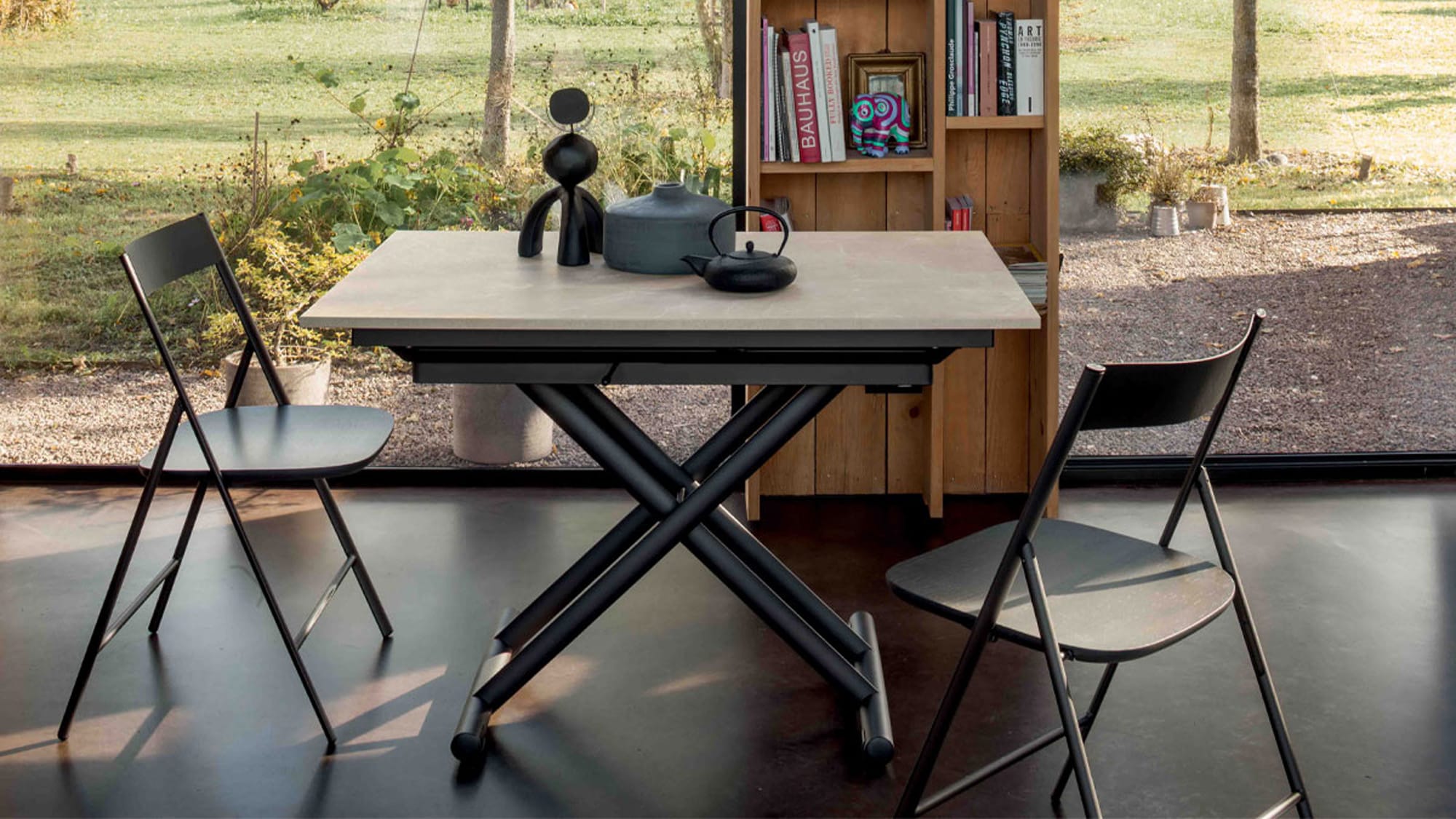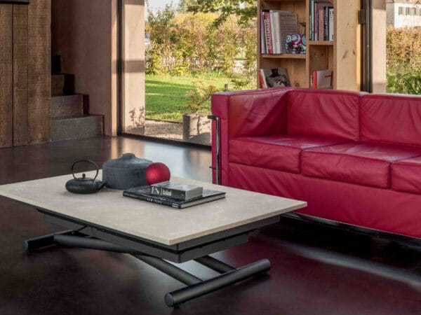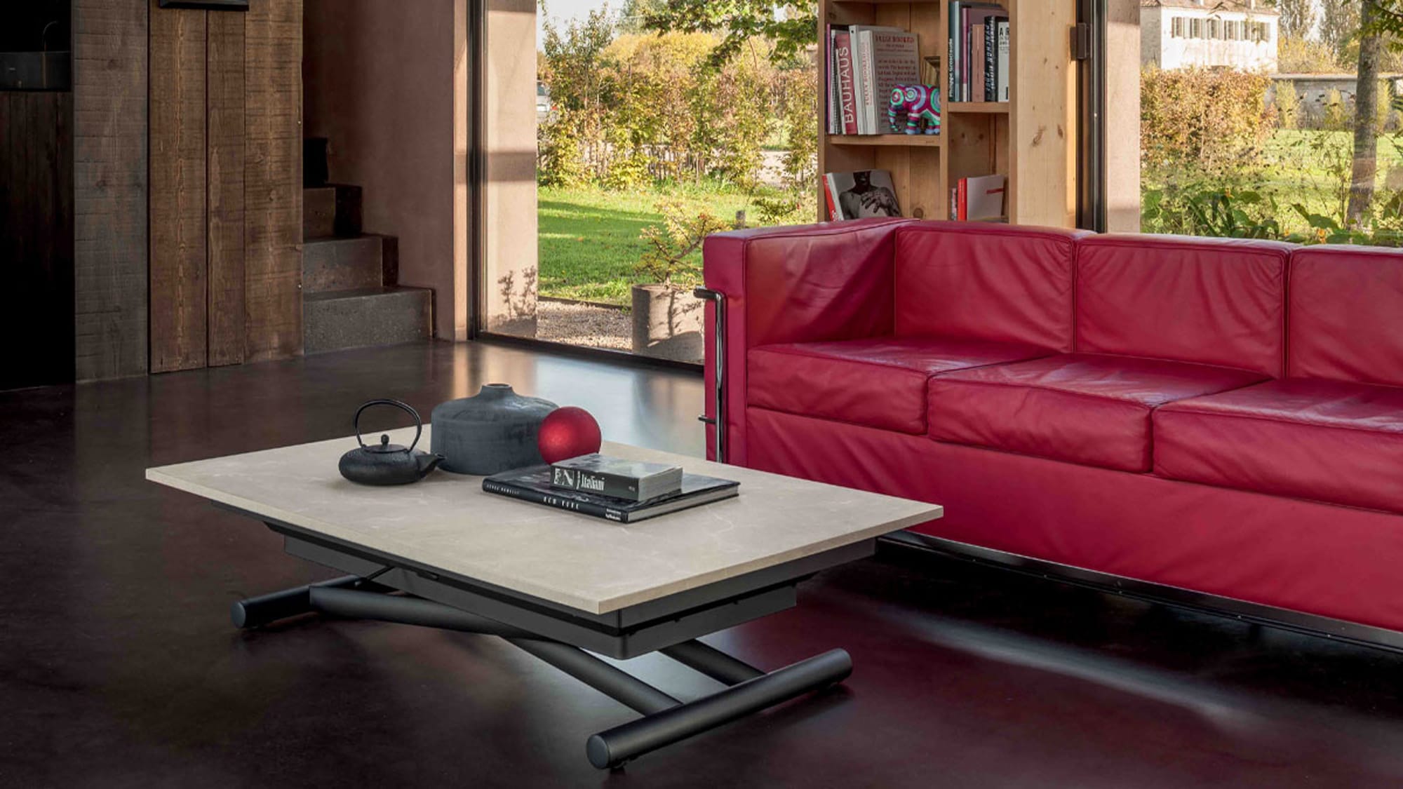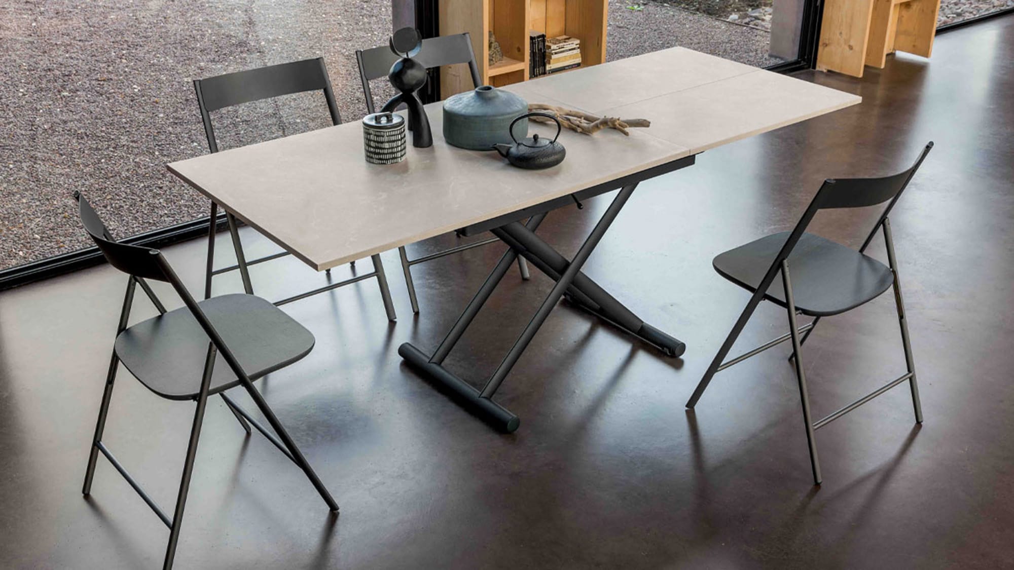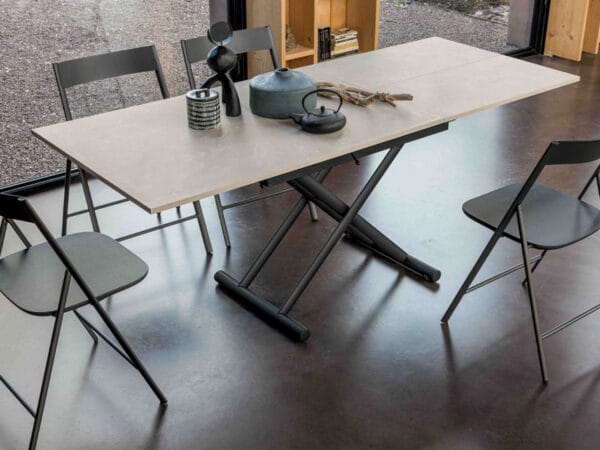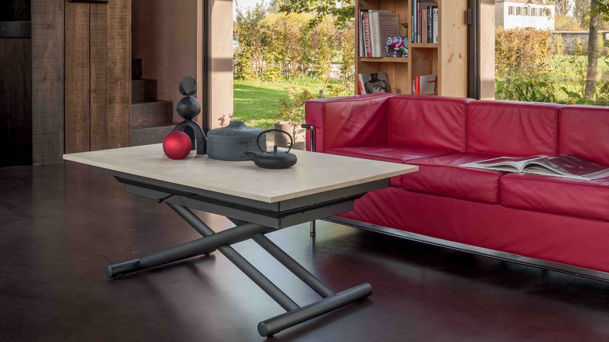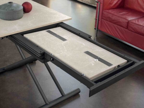 Журнальный столик-трансформер из металлического каркаса, который легко превращается в обеденный стол. Газлифт, высота регулируется от 33 см до 82 см, столешница из меламина, дерева, лака, керамики. Механизм одновременного открывания, базовые колеса. Столешница из керамики или стекла.