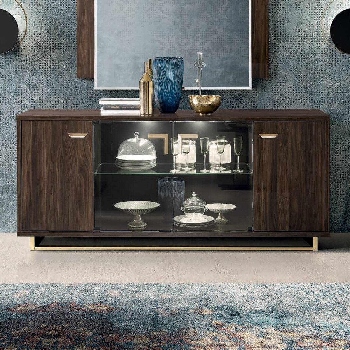 Теплые оттенки ореховой отделки «Патрицио» с прожилками дерева придают элегантность и современность коллекции Volare. Оригинальные ручки треугольной формы отделаны из беленого, сатинированного и матового золота с соответствующими цоколями.